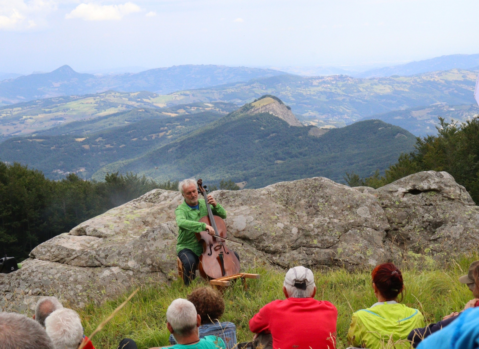 Brunello ha invitato al silenzio prima di iniziare il concerto: la musica deve essere ascoltata senza distrazioni. Il numeroso pubblico era seduto a semicerchio sull’erba della conca del Vallestrina. Con la suite n. 1 di Bach, forse una delle sonate più famose e conosciute, Brunello ha dato inizio al suo concerto, con la bellissima musica che si distende nella magia. del Vallestrina. Il secondo brano è stata la sonata n.1 di un compositore meno noto del ‘900, ma sul quale il maestro si è concentrato negli ultimi anni, Moise Weinberg, Con la suite del compositore spagnolo Gaspar Cassado è stata proposta una danza spagnola molto allegra. Il concerto è proseguito con un brano dedicato alla montagna, Stelutis Alpinis di Arturo Zardini, una canzone storica che ricorda i morti della grande guerra. In chiusura Brunello ha proposto una canzone popolare armena, in ricordo di un viaggio effettuato assieme a De Stefani. E’ stato un concerto che ha entusiasmato e affascinato il pubblico, grazie alla maestria di Brunello. La musica, un violoncello, le montagne. E tutti in ascolto ammirando la montagna in tutta la sua bellezza. Sono suoni nuovi d’Appennino.