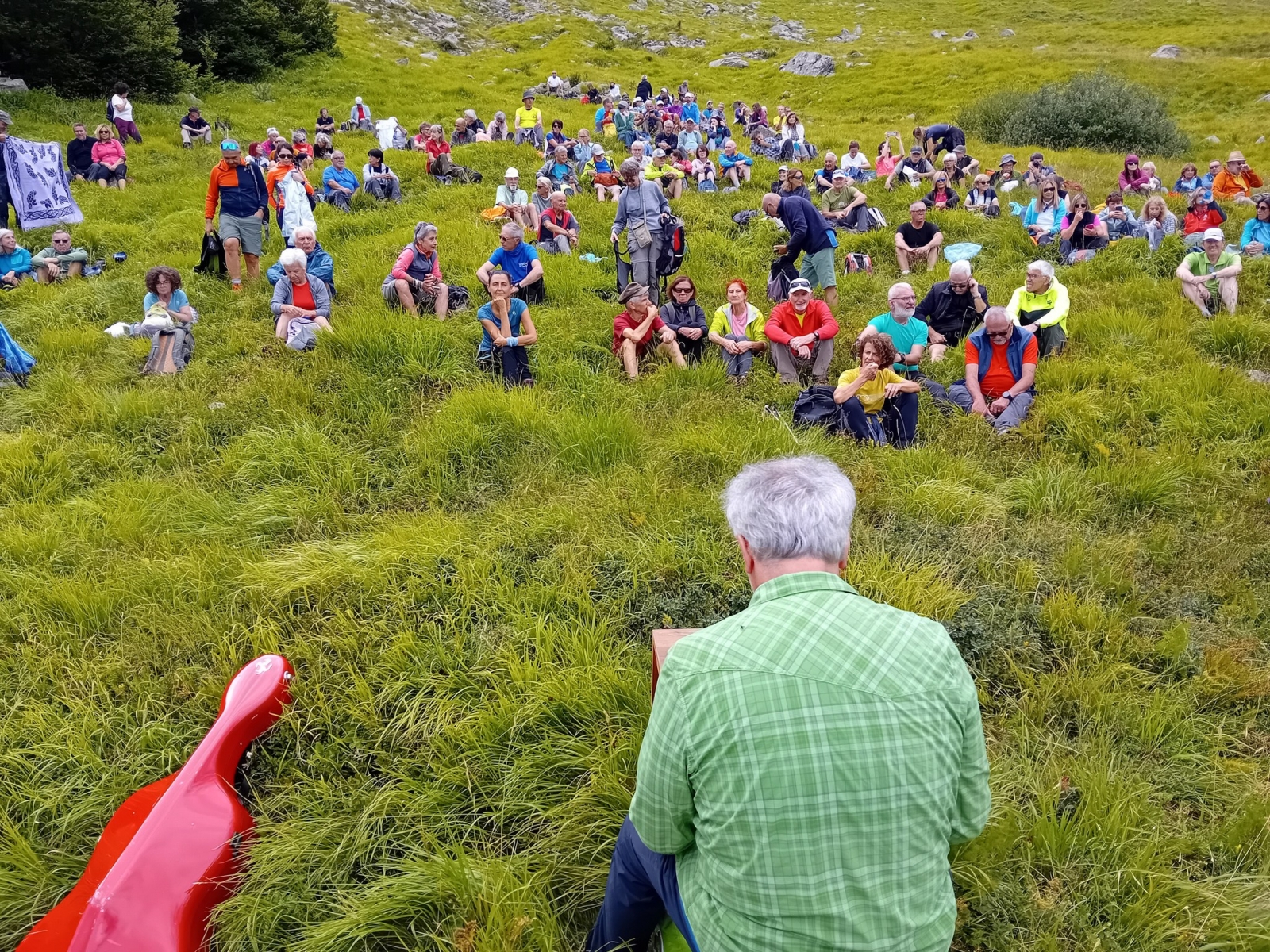 Anche il maestro Brunello, assieme all’amico e grandissimo alpinista Fausto De Stefani, è salito lungo il sentiero al bivacco, camminando in testa al gruppo, ma con uno “zaino” del tutto particolare: una custodia dal colore rosso con dentro il violoncello.