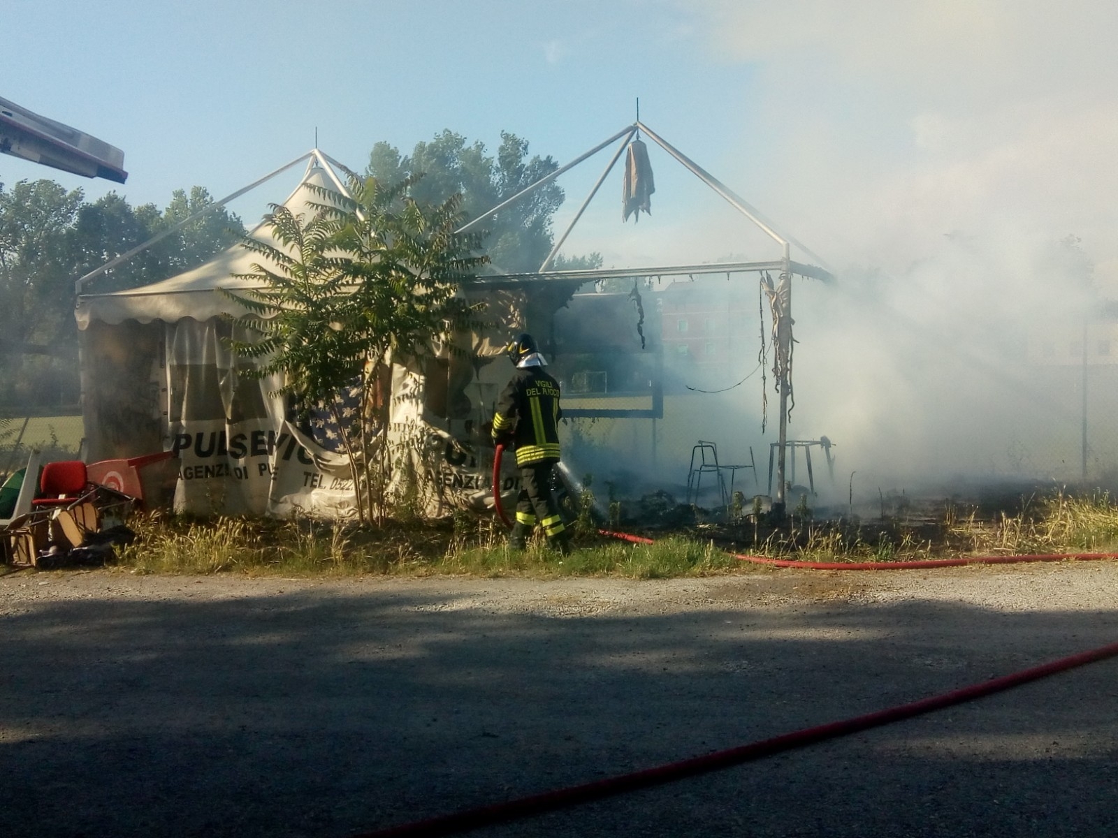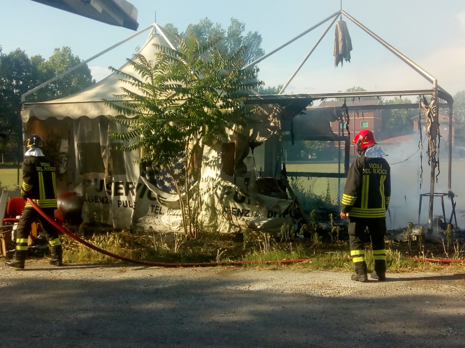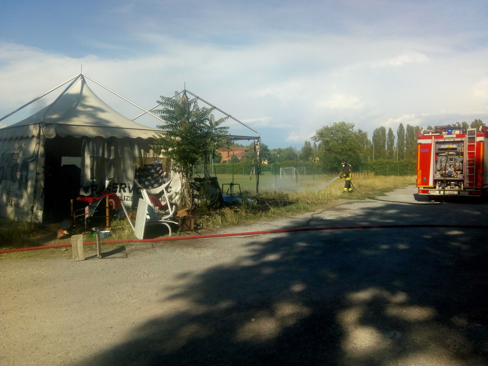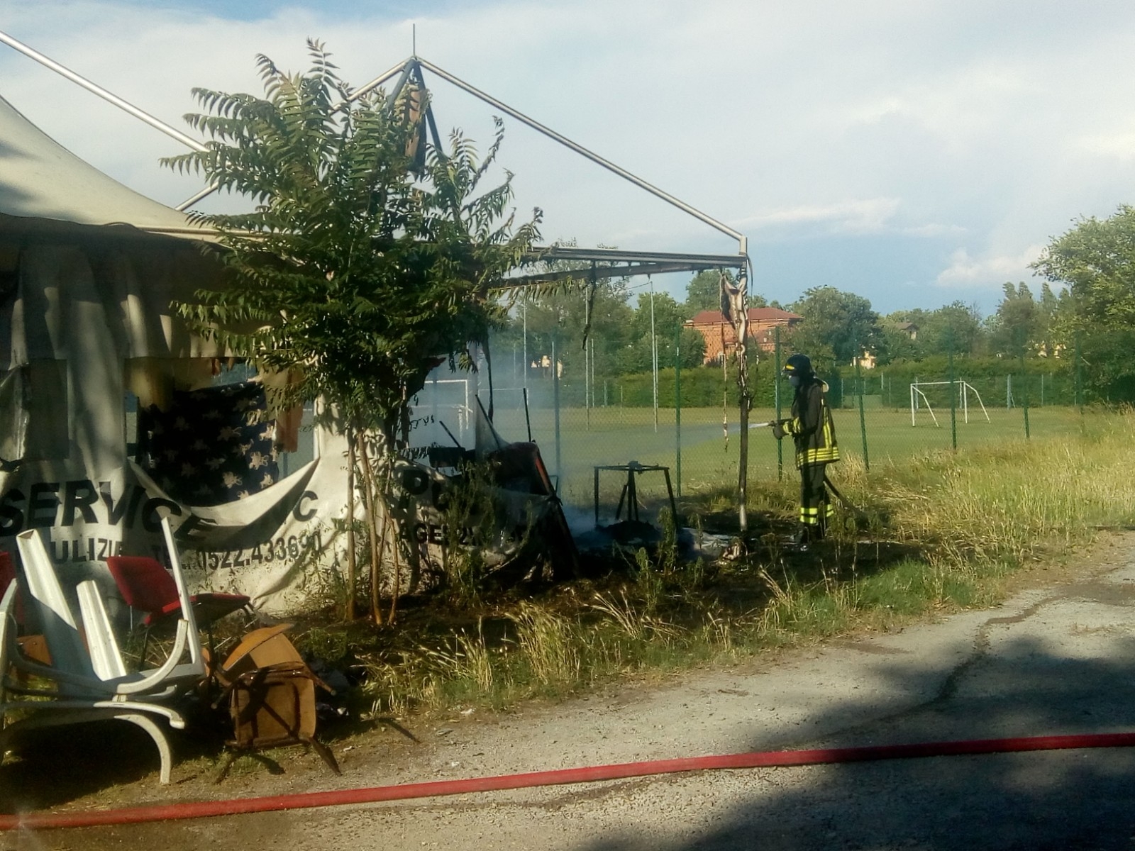 REGGIO EMILIA – Un incendio ha distrutto nel pomeriggio i due gazebo tanto familiari a chi segue la Reggiana. La chiamata ai vigili del fuoco è arrivata alle 17,45. Quando i mezzi sono arrivati in via Agosti, dove da sempre e fino a due anni fa si è allenata la squadra granata, gli uomini di via della Canalina non hanno potuto fare altro che spegnere le fiamme. I gazebo sono nel parcheggio, a ridosso della rete del campo di allenamento, un tempo spazio di attesa per i giornalisti impegnati nelle interviste e cari anche a un ristretto numero di tifosi pensionati, spesso impegnati anche a giocare a carte tra un commento e l’altro sulla squadra. All’interno, come potete vedere dai video, reti per dormire e i segni evidenti di un bivacco. Evidentemente i gazebo erano divenuti rifugio per senzatetto. Tutto a pochi metri dalle ex Reggiane.