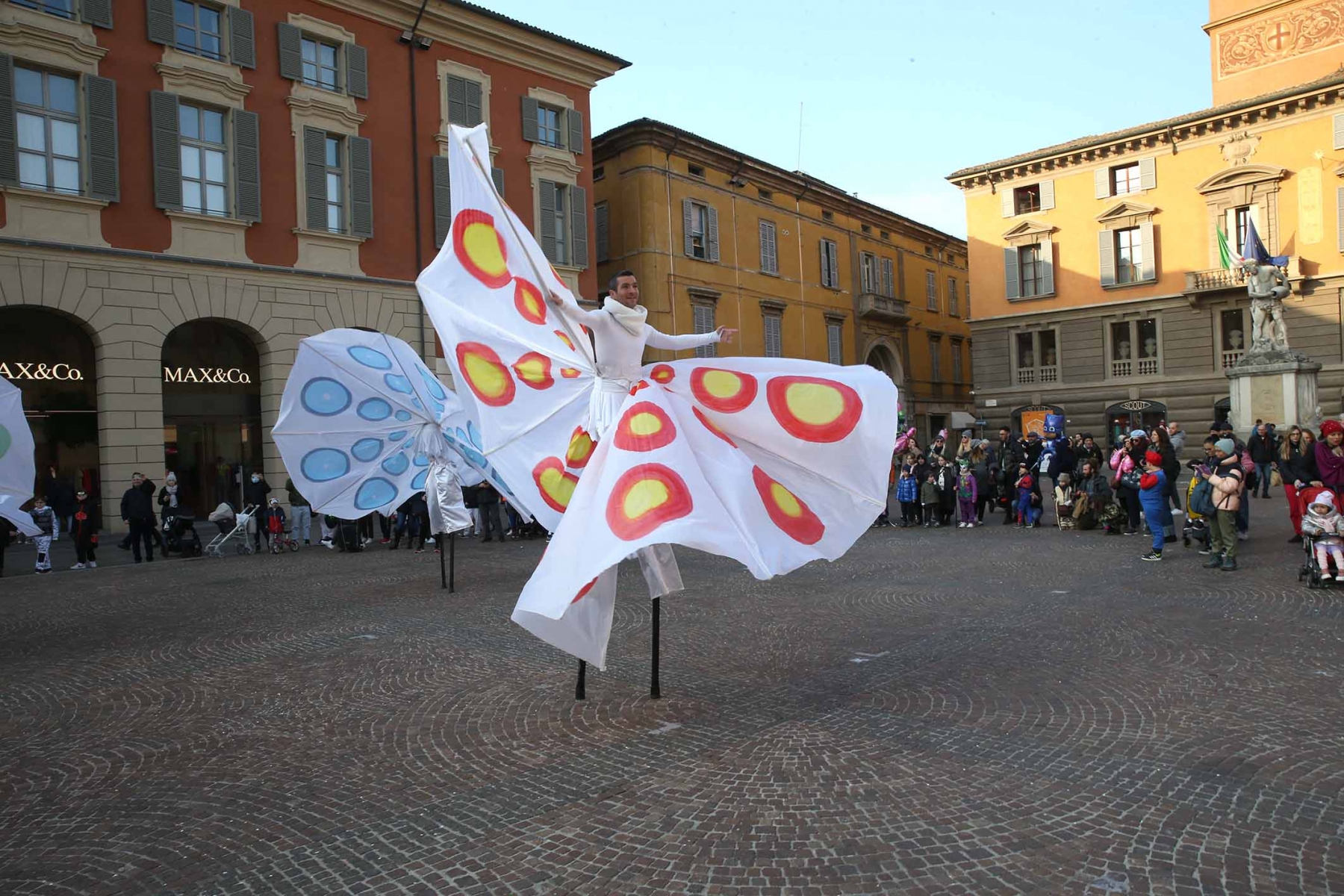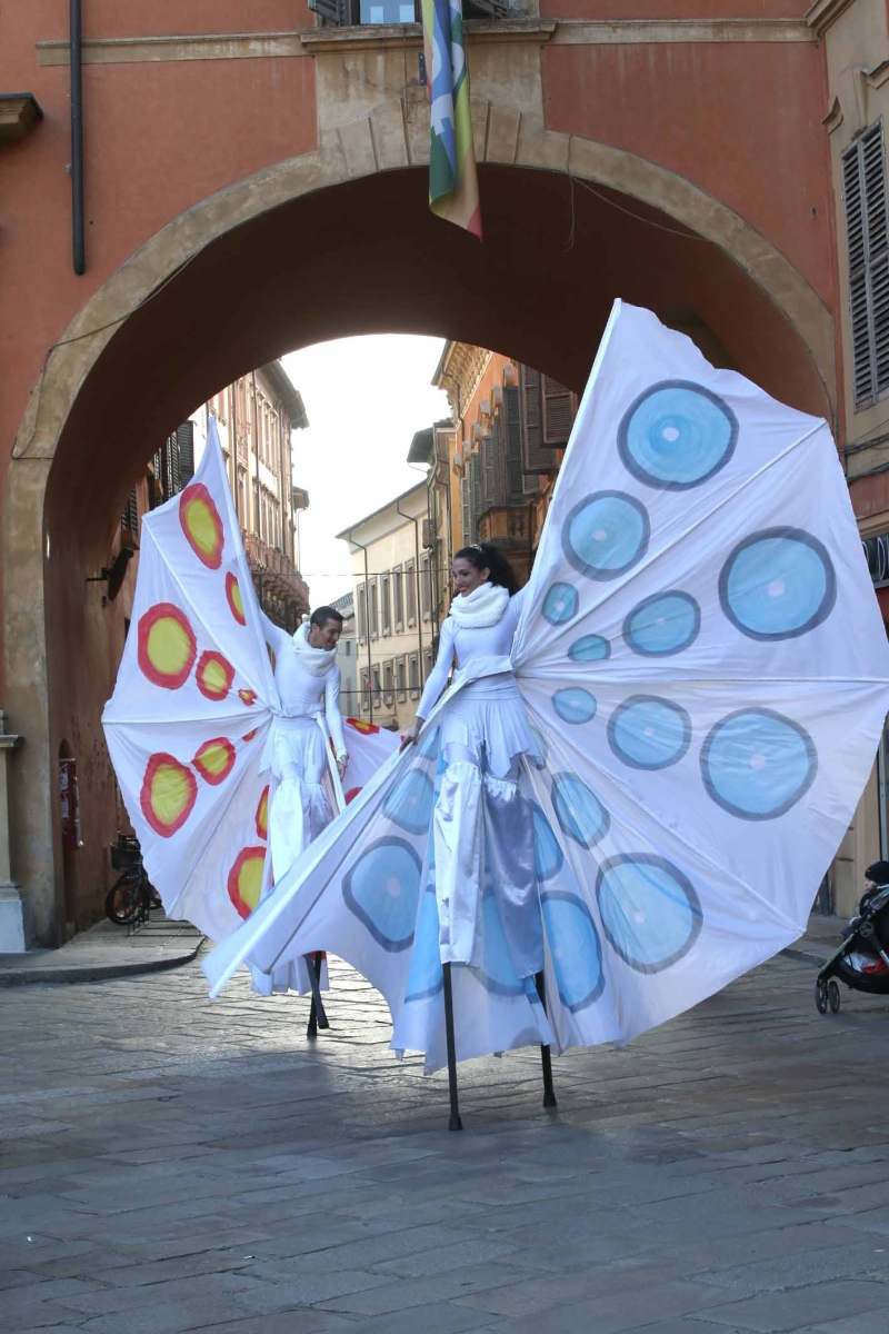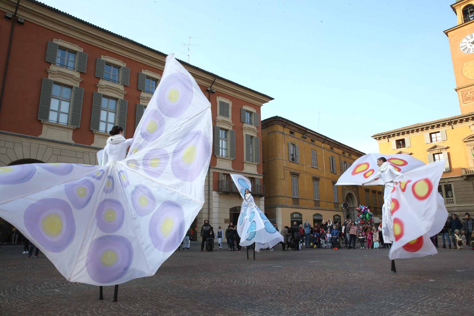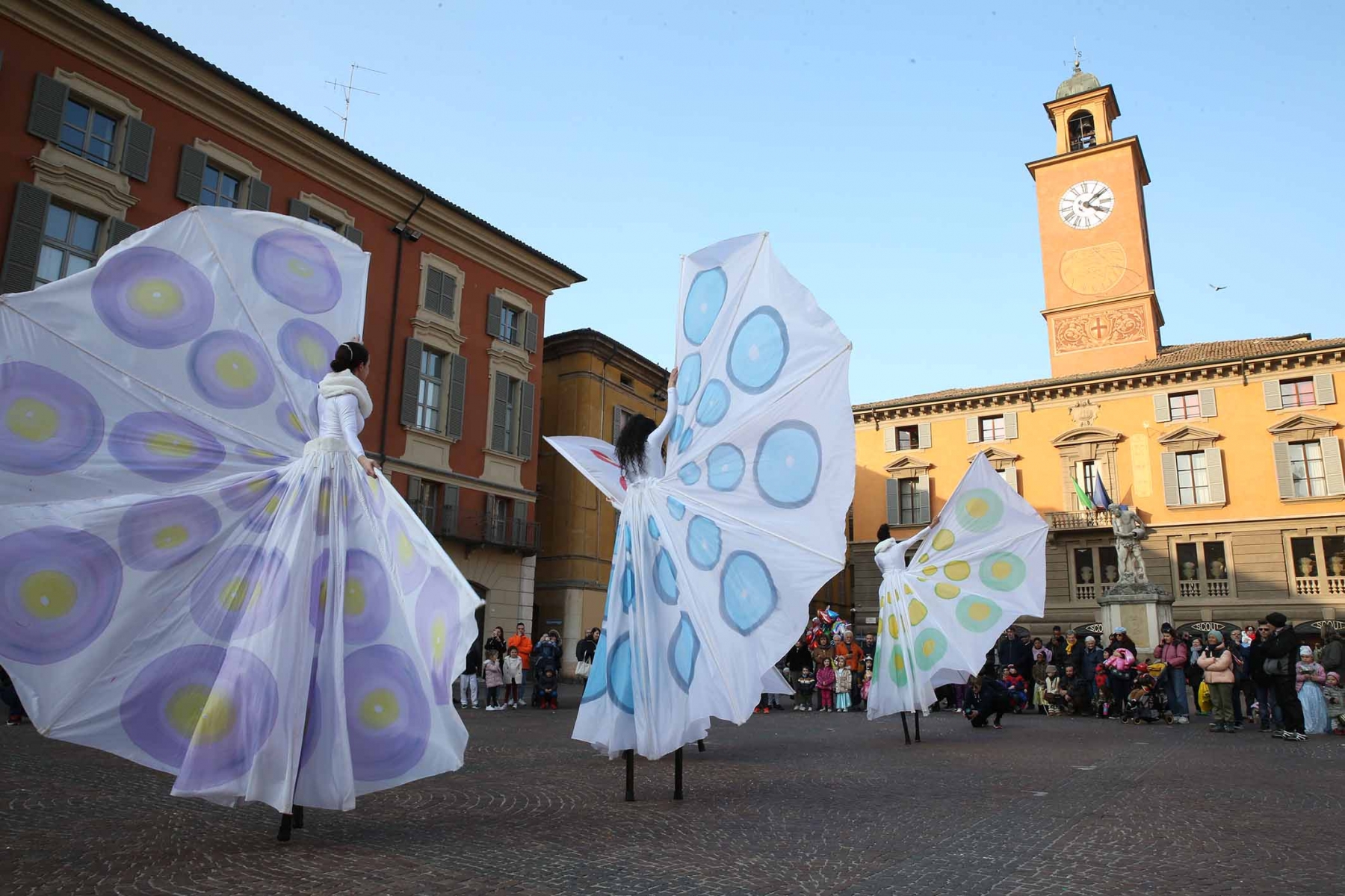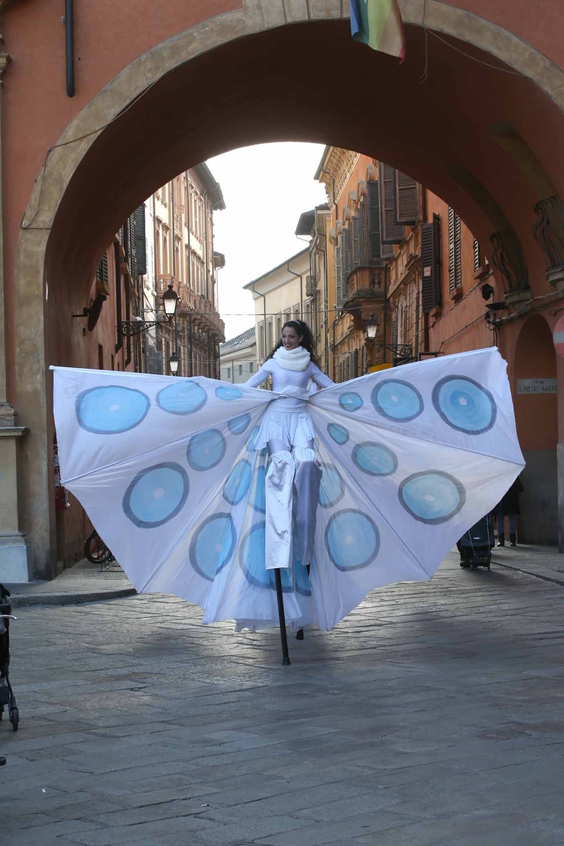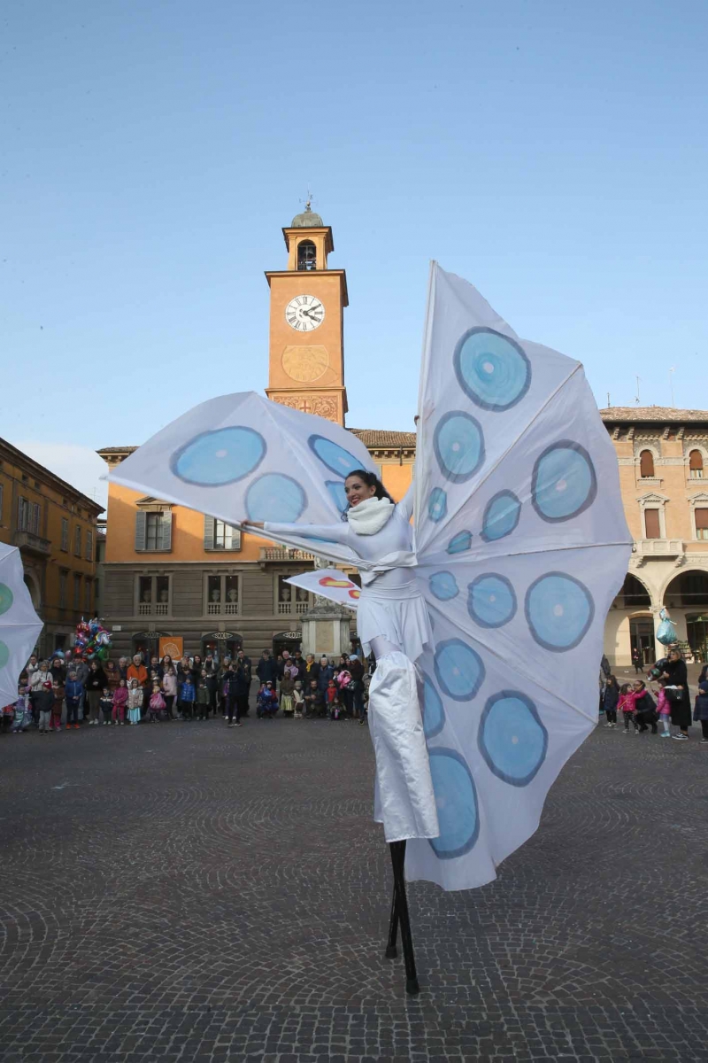 21 febbraio 2023Nel pomeriggio piazza Prampolini e piazza Martiri sono state invase dai tanti bambini che prima hanno seguito uno spettacolo di musica e danza con tanto di valzer sui trampoli e farfalle di seta, poi hanno giocato tra loro interpretando i supereroi preferiti