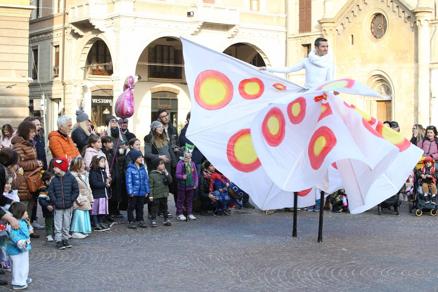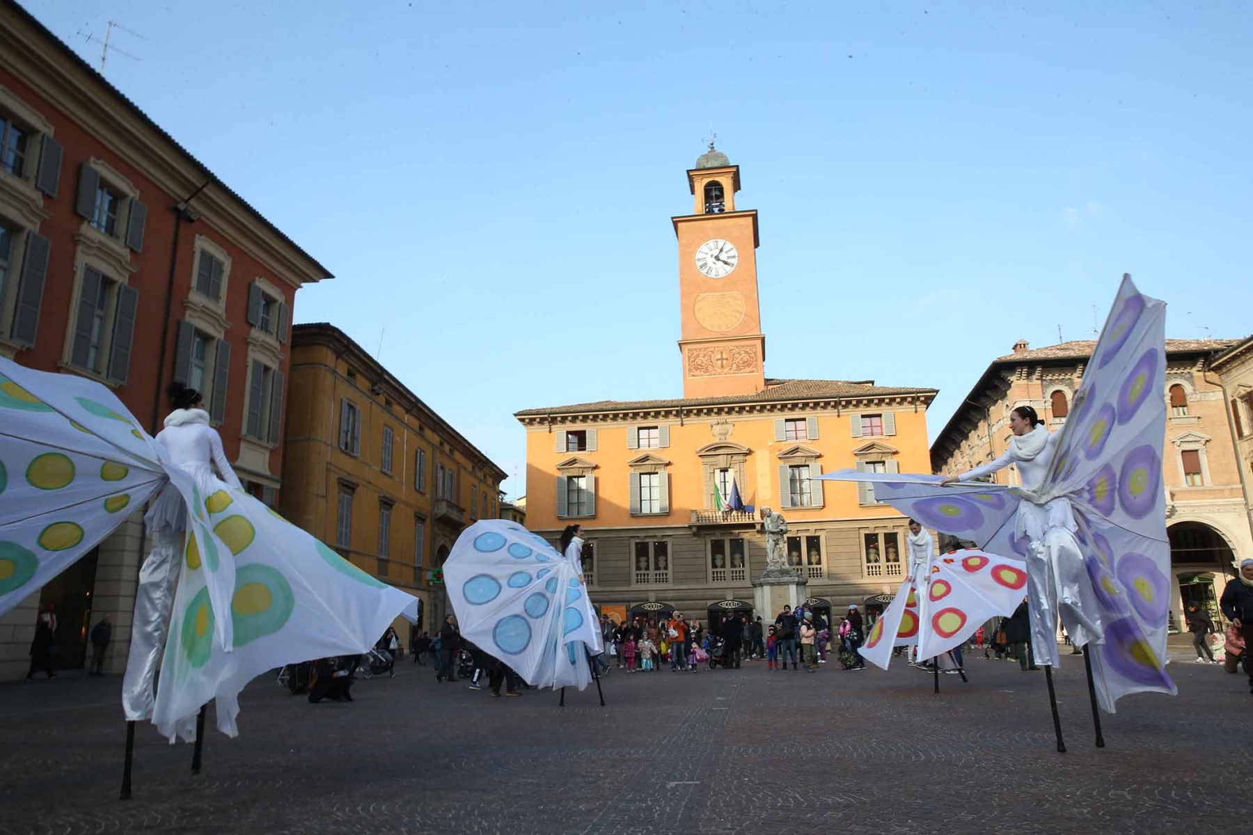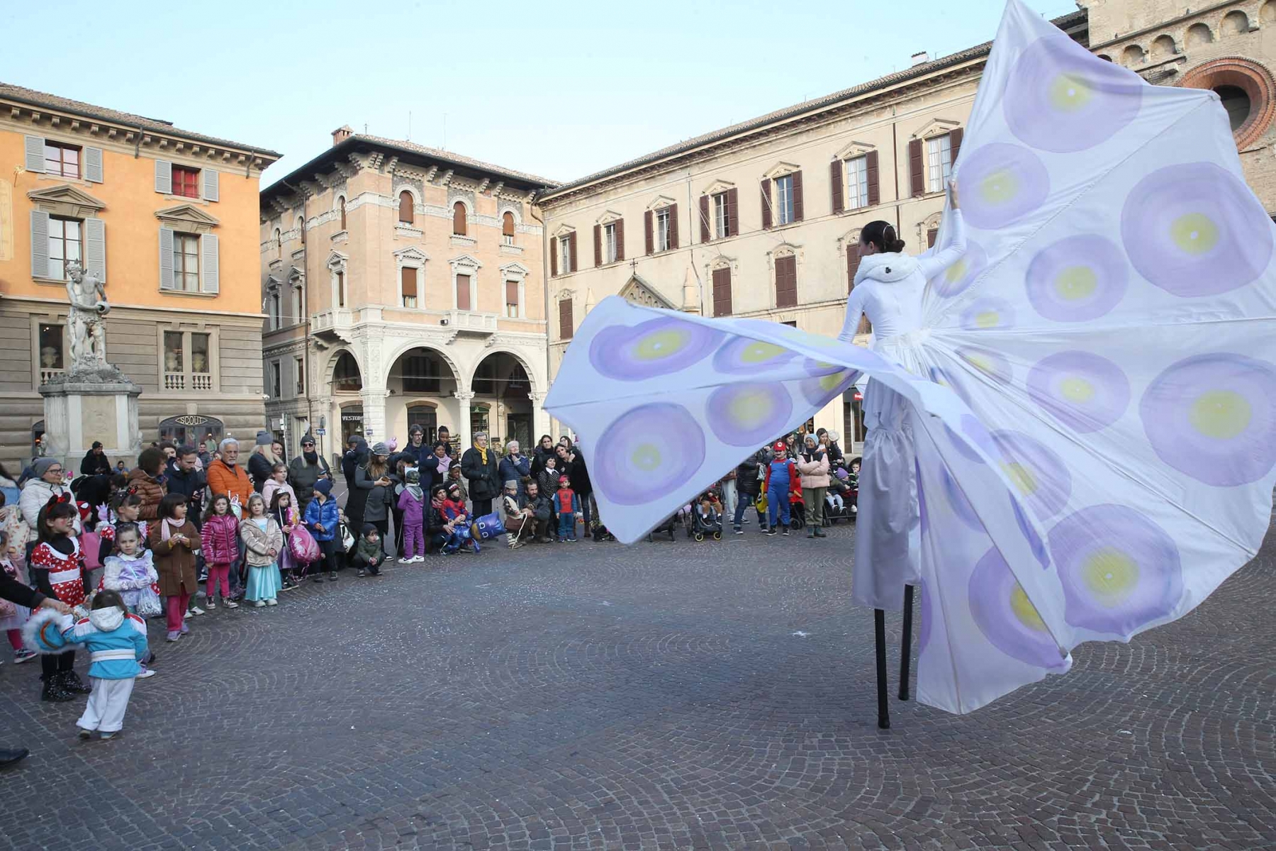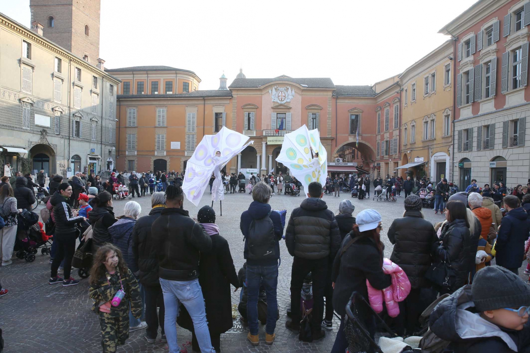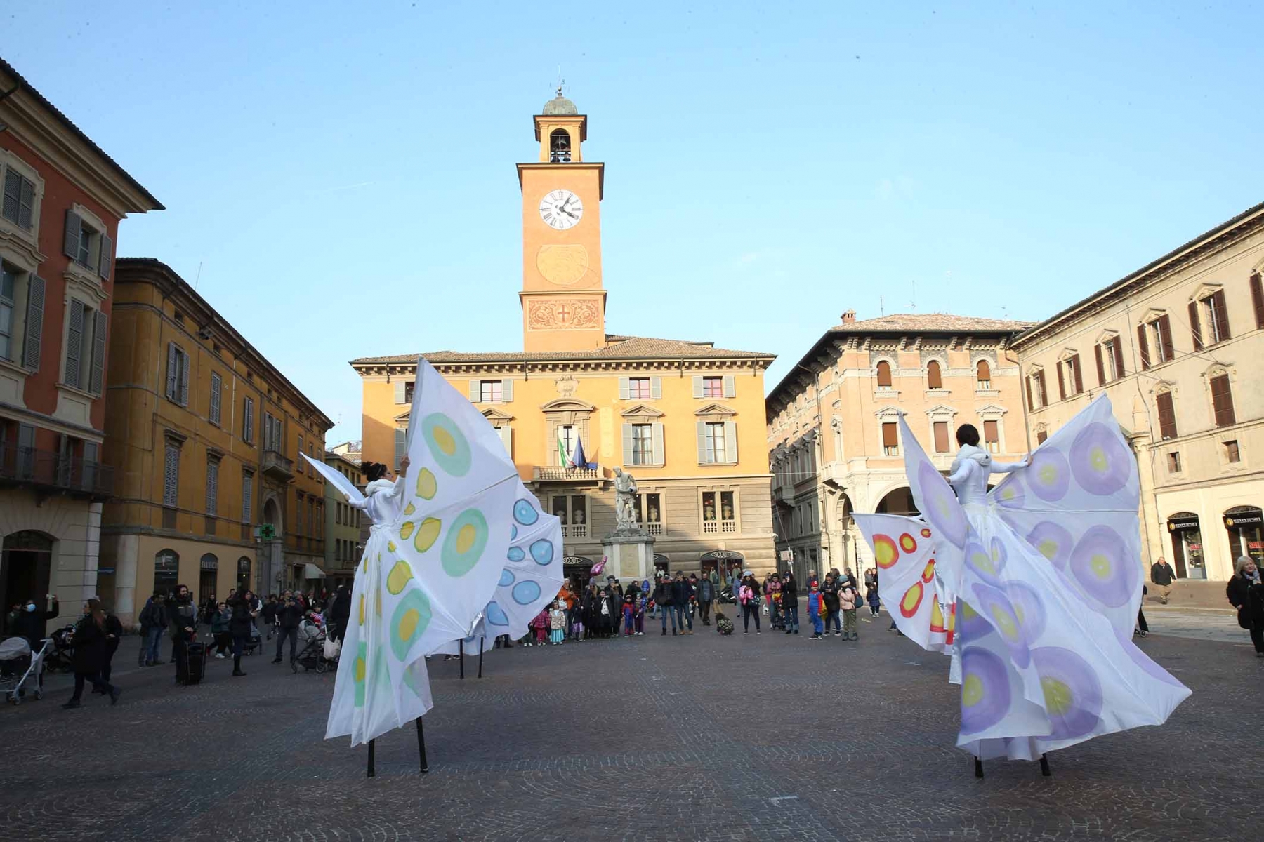 21 febbraio 2023Nel pomeriggio piazza Prampolini e piazza Martiri sono state invase dai tanti bambini che prima hanno seguito uno spettacolo di musica e danza con tanto di valzer sui trampoli e farfalle di seta, poi hanno giocato tra loro interpretando i supereroi preferiti