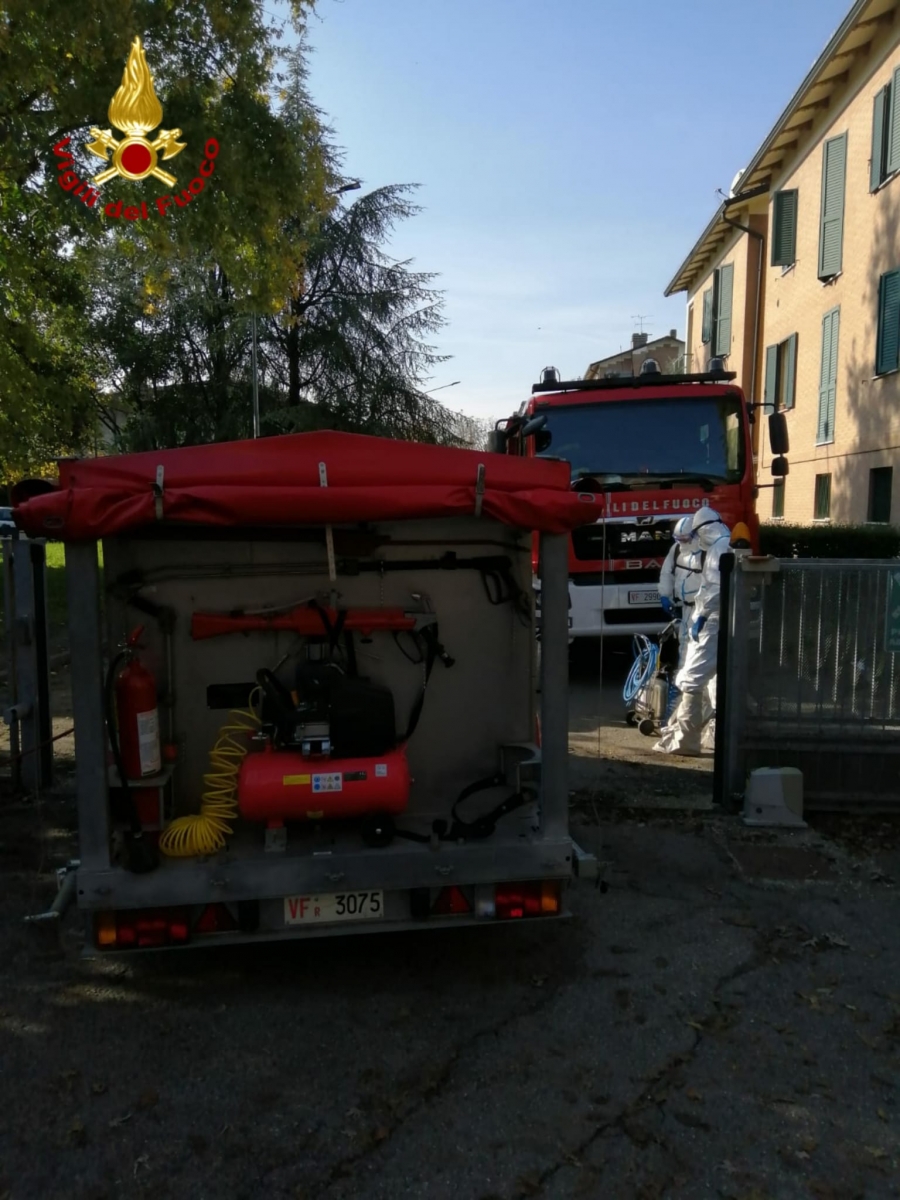RUBIERA (Reggio Emilia) – I vigili del fuoco sono intervenuti nel pomeriggio a Rubiera, per sanificare alcuni locali della casa di riposo. Una richiesta giunta al comando dal Comune, alla luce dei diversi casi di contagio tra gli ospiti. I vigili del fuoco sono entrati in azione in accordo anche con l’Ausl. L’intervento è durato in tutto circa due ore, senza rendere necessario il trasferimento degli ospiti. Agli uomini di via della Canalina è arrivato il grazie del sindaco Emanuele Cavallaro.