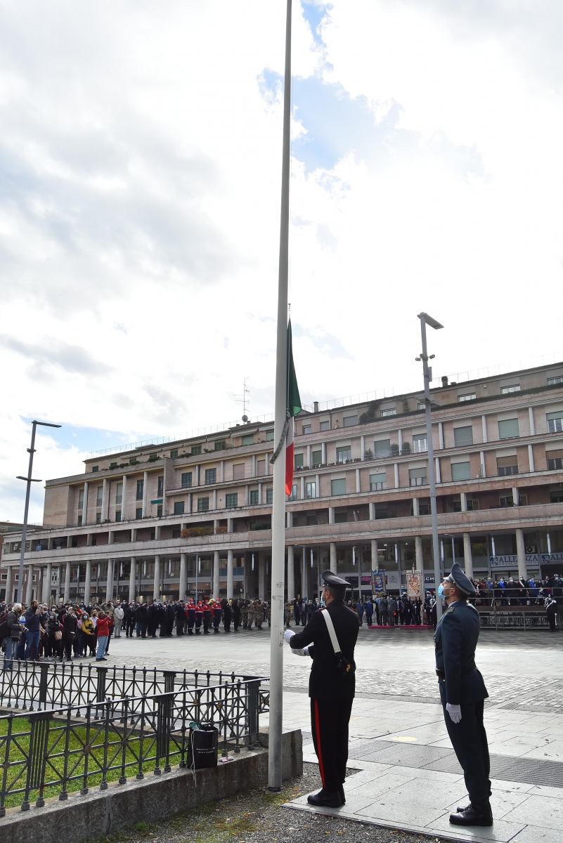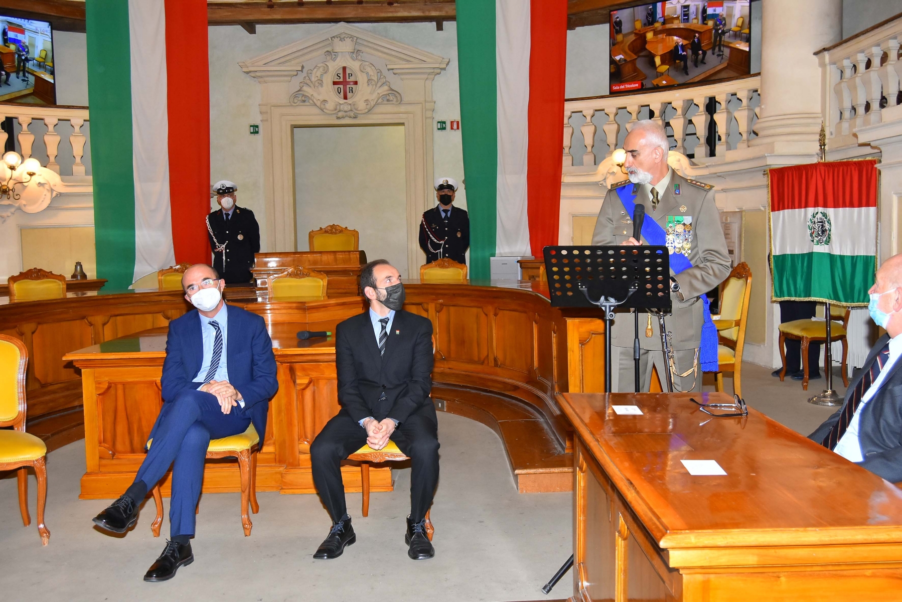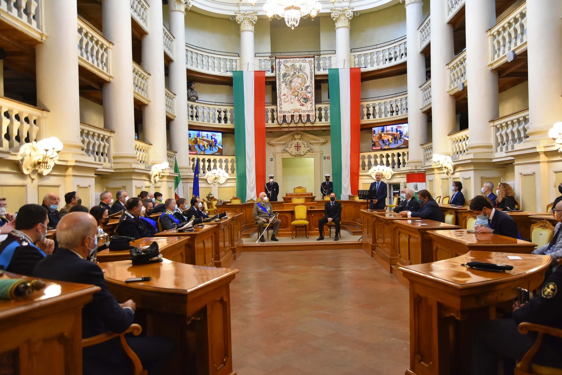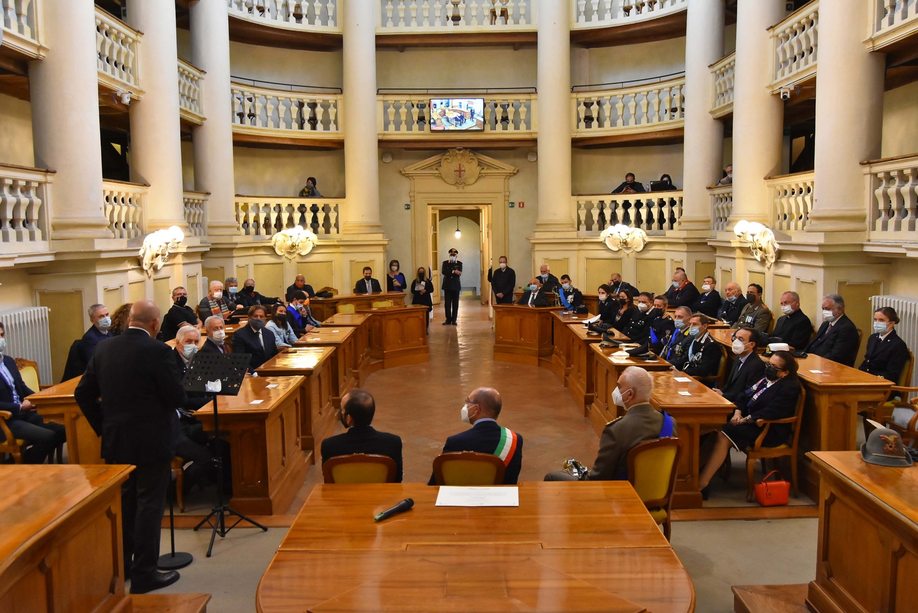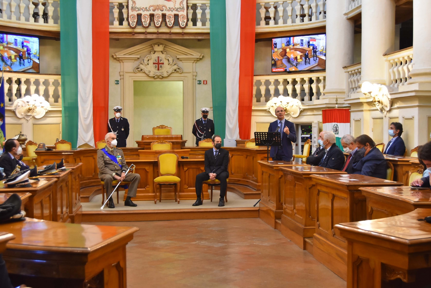 Le note dell’inno nazionale risuonano in piazza della Vittoria. L’alzabandiera davanti al monumento ai Caduti è soltanto uno dei diversi momenti celebrativi dedicati al 4 novembre, giornata dell’Unità Nazionale e delle Forze Armate. La ricorrenza coincide quest’anno col centenario della tumulazione del Milite Ignoto posto al centro dell’Altare della Patria a Roma. “Un militare senza nome che ci consegna la consapevolezza del percorso faticoso compiuto dal Paese per ritrovare la sua unità tra tante diversità”, le parole del sindaco Luca Vecchi in Sala del Tricolore dove è stata conferita la cittadinanza onoraria al soldato simbolo perito al fronte durante la Grande guerra.