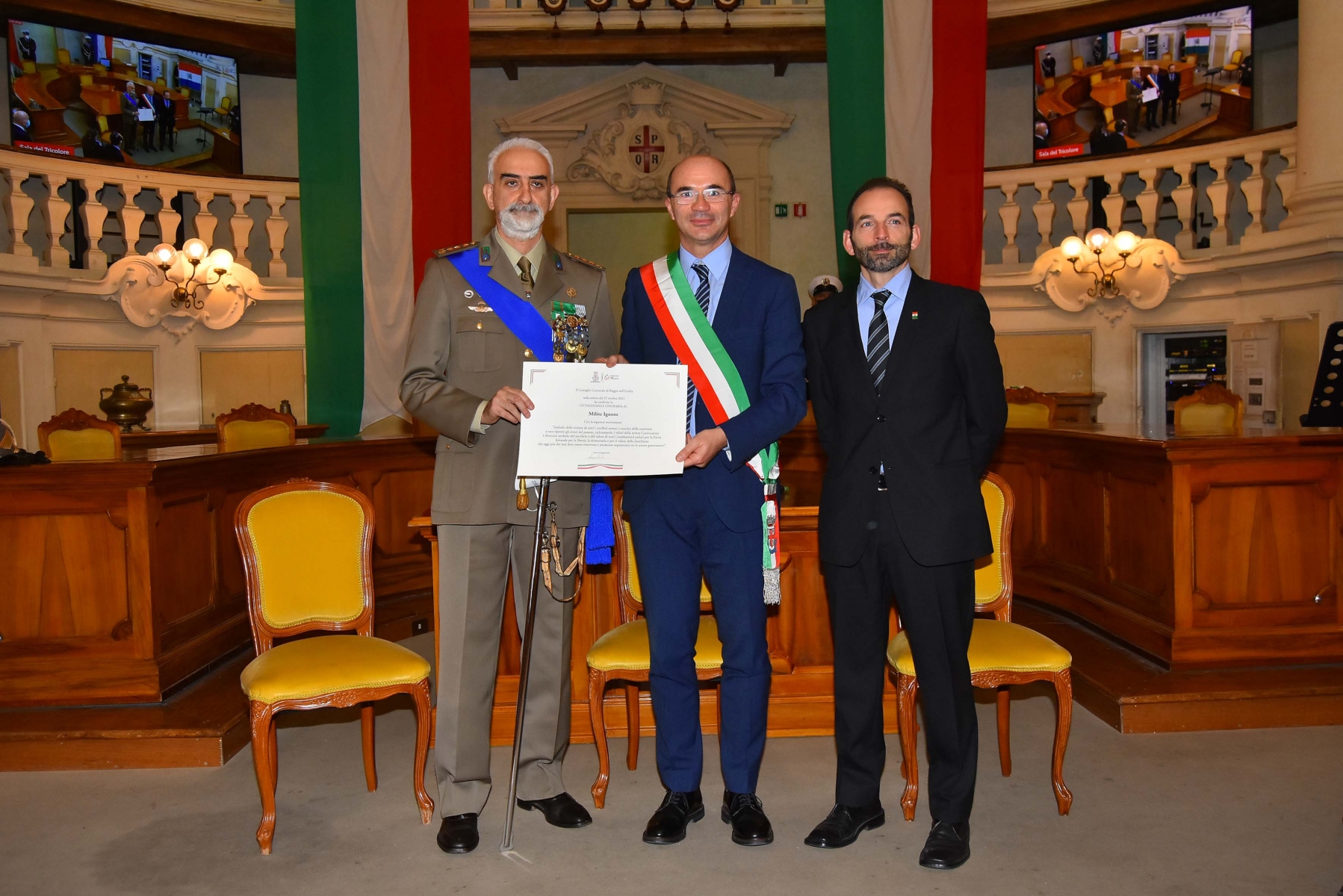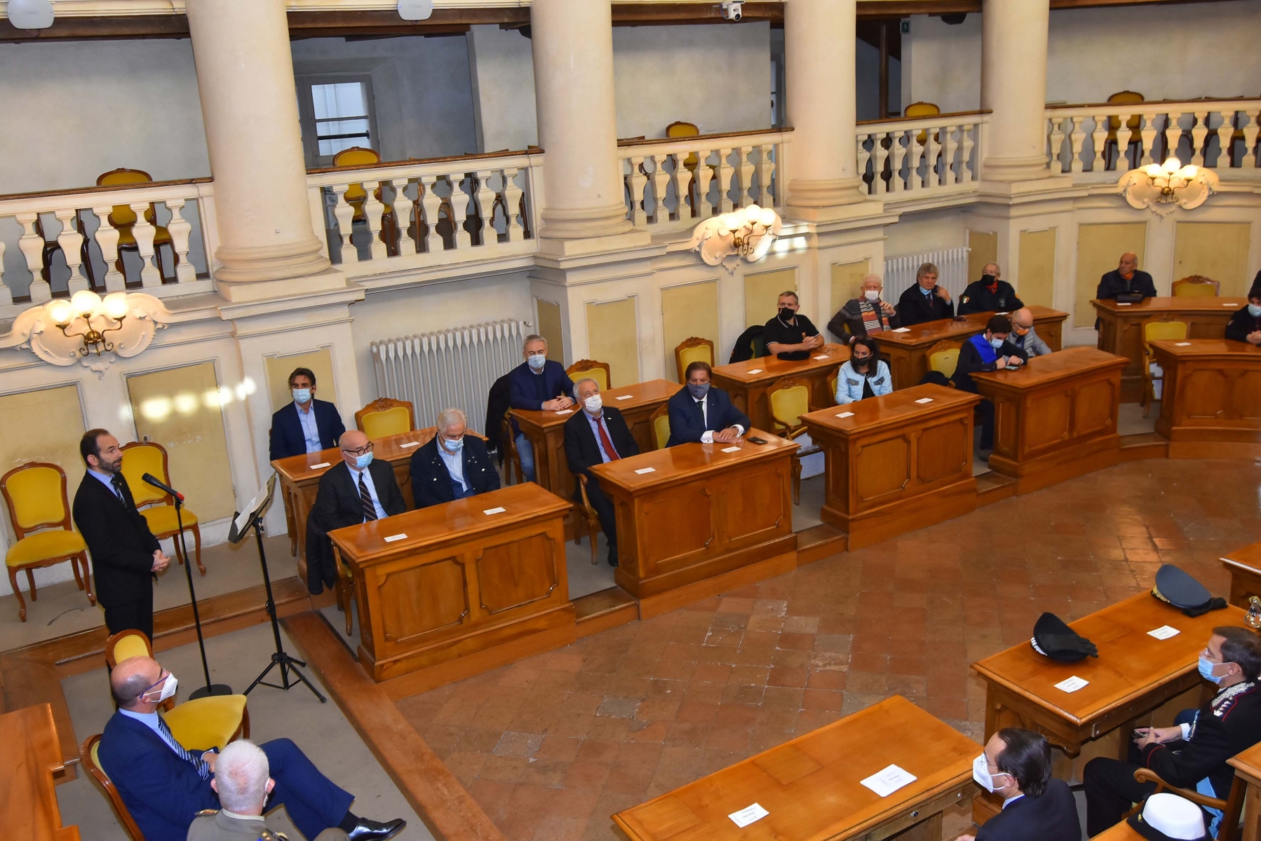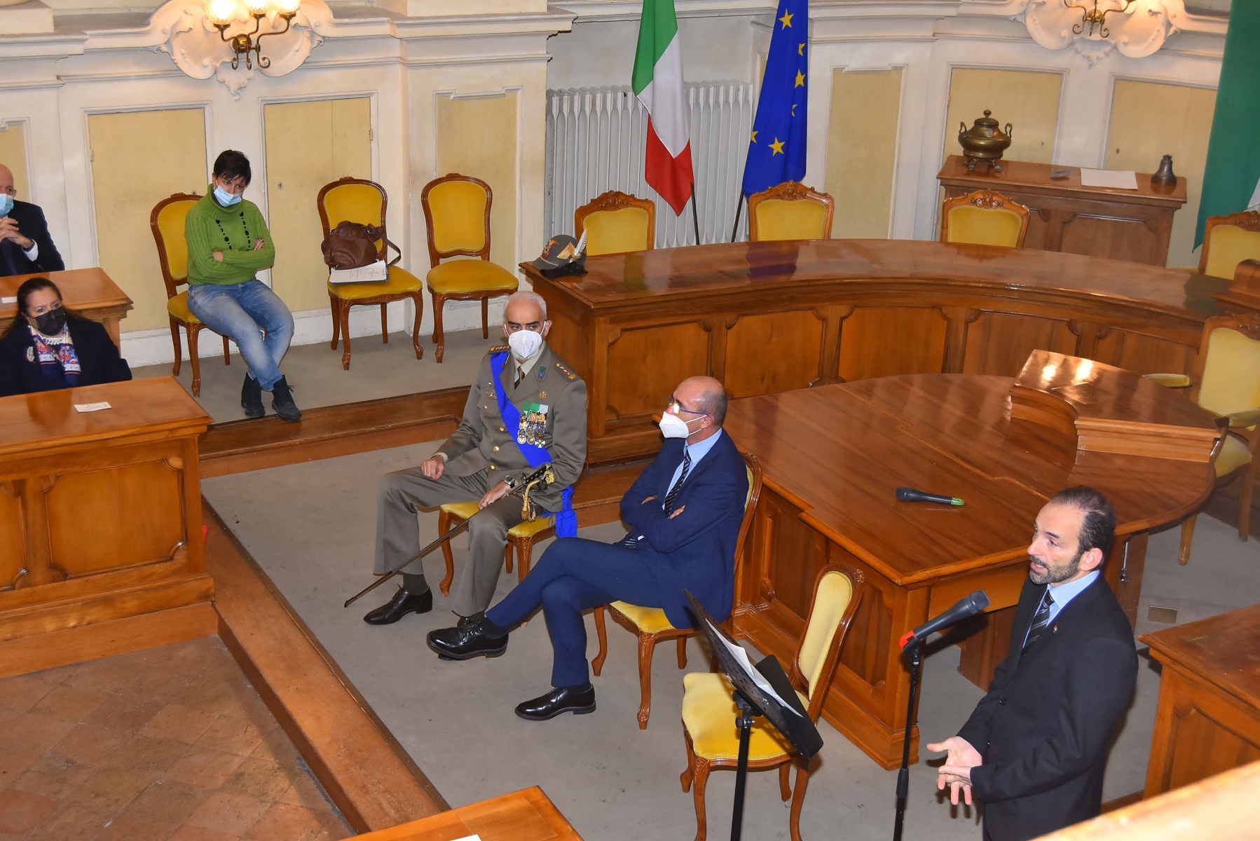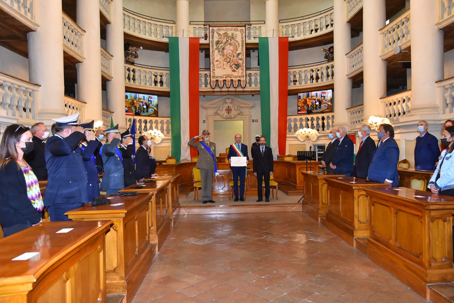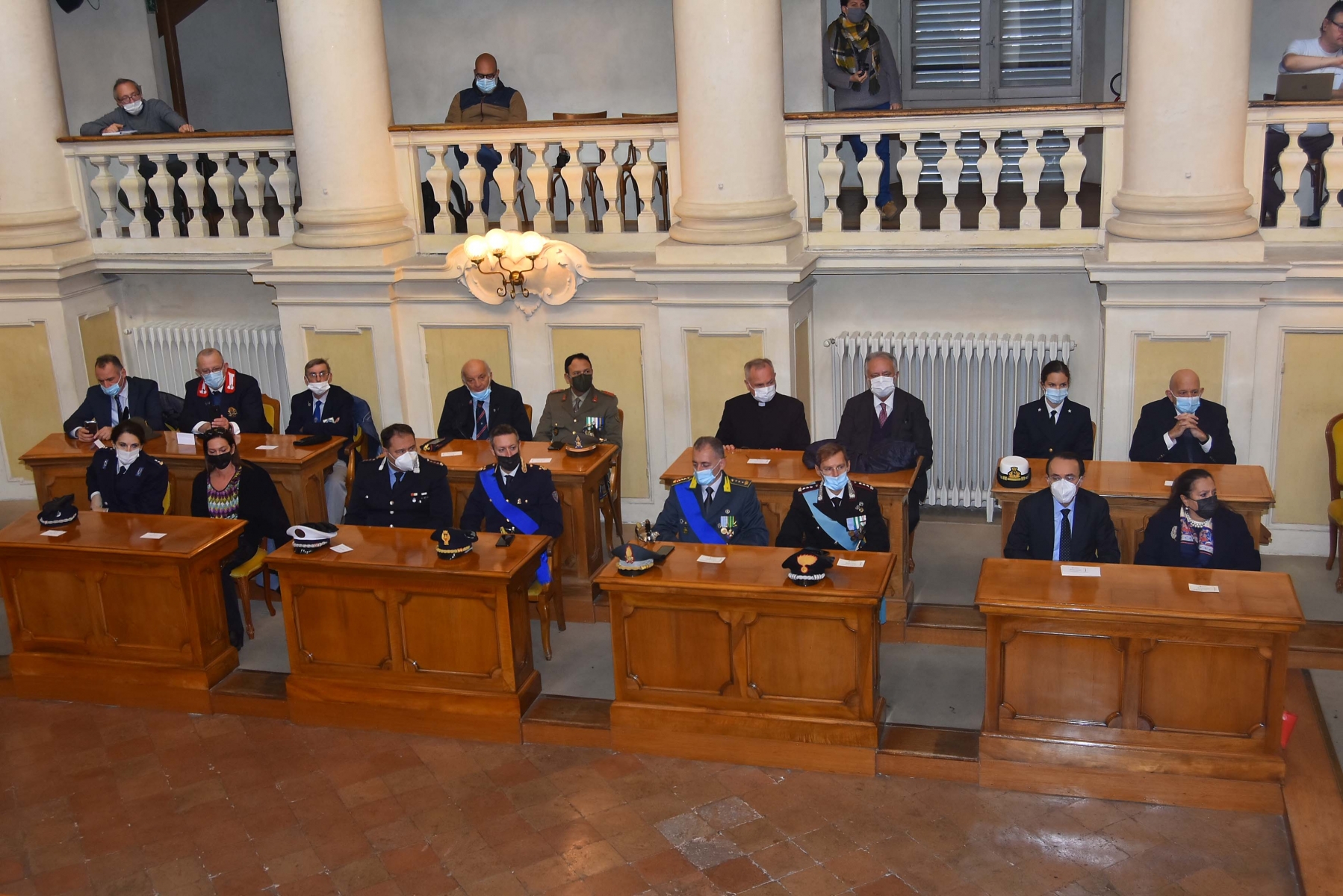 Le note dell’inno nazionale risuonano in piazza della Vittoria. L’alzabandiera davanti al monumento ai Caduti è soltanto uno dei diversi momenti celebrativi dedicati al 4 novembre, giornata dell’Unità Nazionale e delle Forze Armate. La ricorrenza coincide quest’anno col centenario della tumulazione del Milite Ignoto posto al centro dell’Altare della Patria a Roma. “Un militare senza nome che ci consegna la consapevolezza del percorso faticoso compiuto dal Paese per ritrovare la sua unità tra tante diversità”, le parole del sindaco Luca Vecchi in Sala del Tricolore dove è stata conferita la cittadinanza onoraria al soldato simbolo perito al fronte durante la Grande guerra.