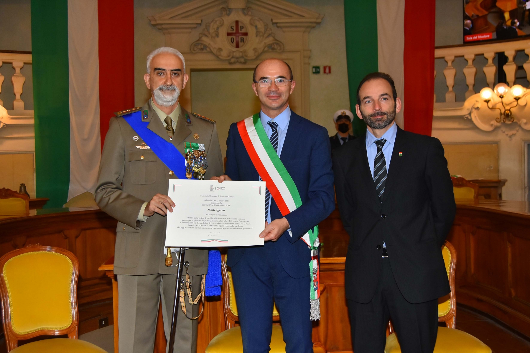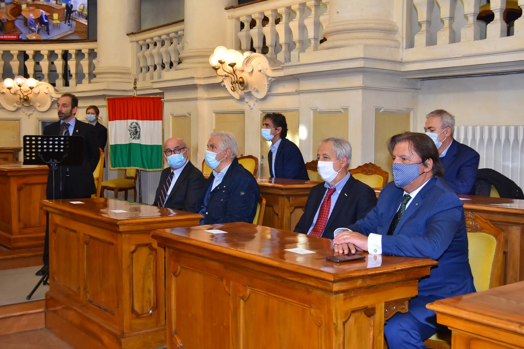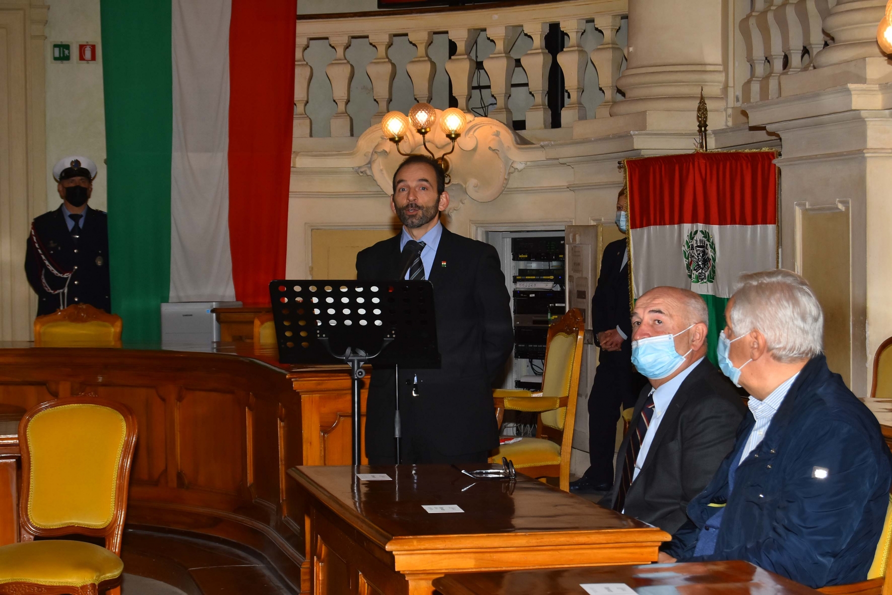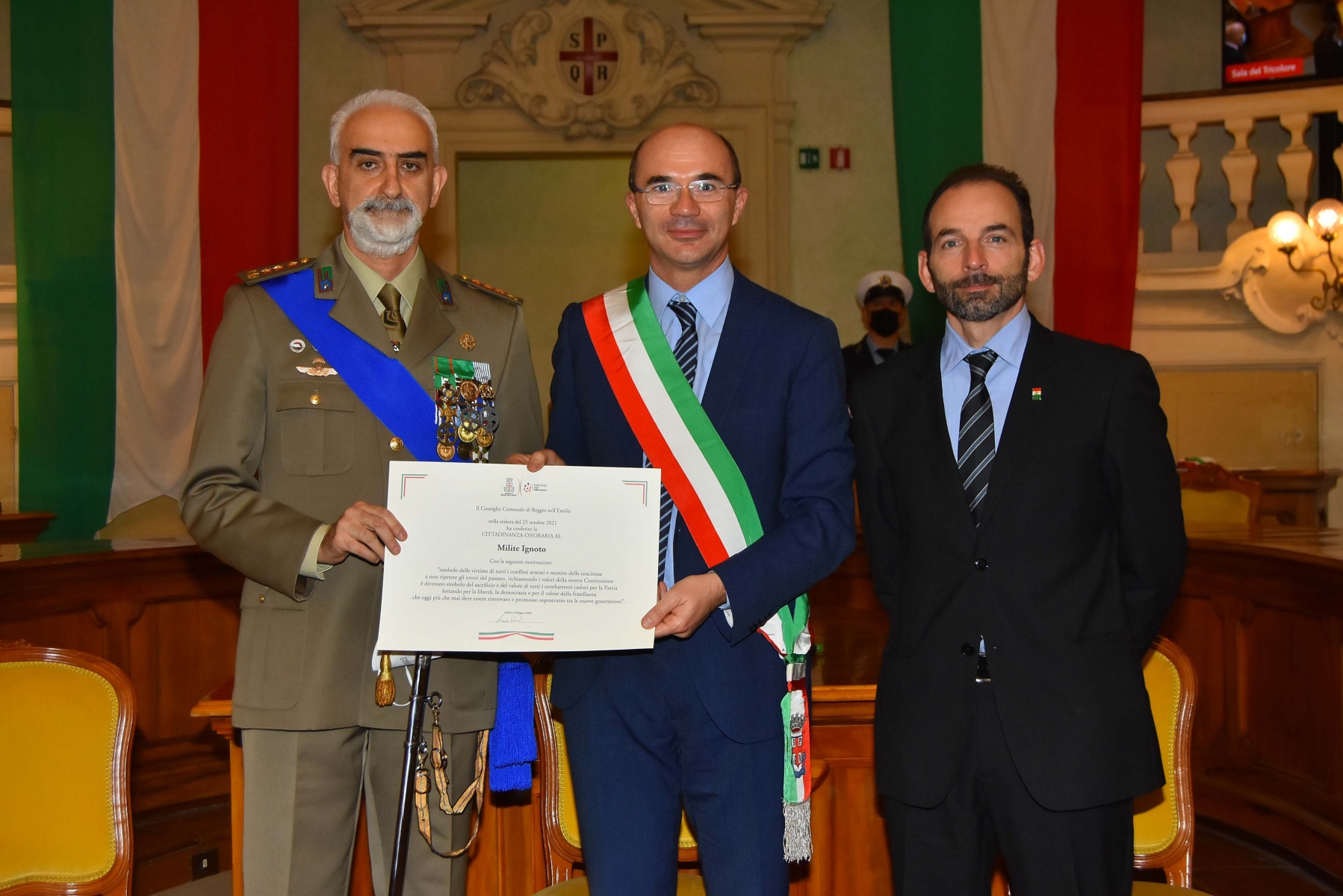 Le note dell’inno nazionale risuonano in piazza della Vittoria. L’alzabandiera davanti al monumento ai Caduti è soltanto uno dei diversi momenti celebrativi dedicati al 4 novembre, giornata dell’Unità Nazionale e delle Forze Armate. La ricorrenza coincide quest’anno col centenario della tumulazione del Milite Ignoto posto al centro dell’Altare della Patria a Roma. “Un militare senza nome che ci consegna la consapevolezza del percorso faticoso compiuto dal Paese per ritrovare la sua unità tra tante diversità”, le parole del sindaco Luca Vecchi in Sala del Tricolore dove è stata conferita la cittadinanza onoraria al soldato simbolo perito al fronte durante la Grande guerra.