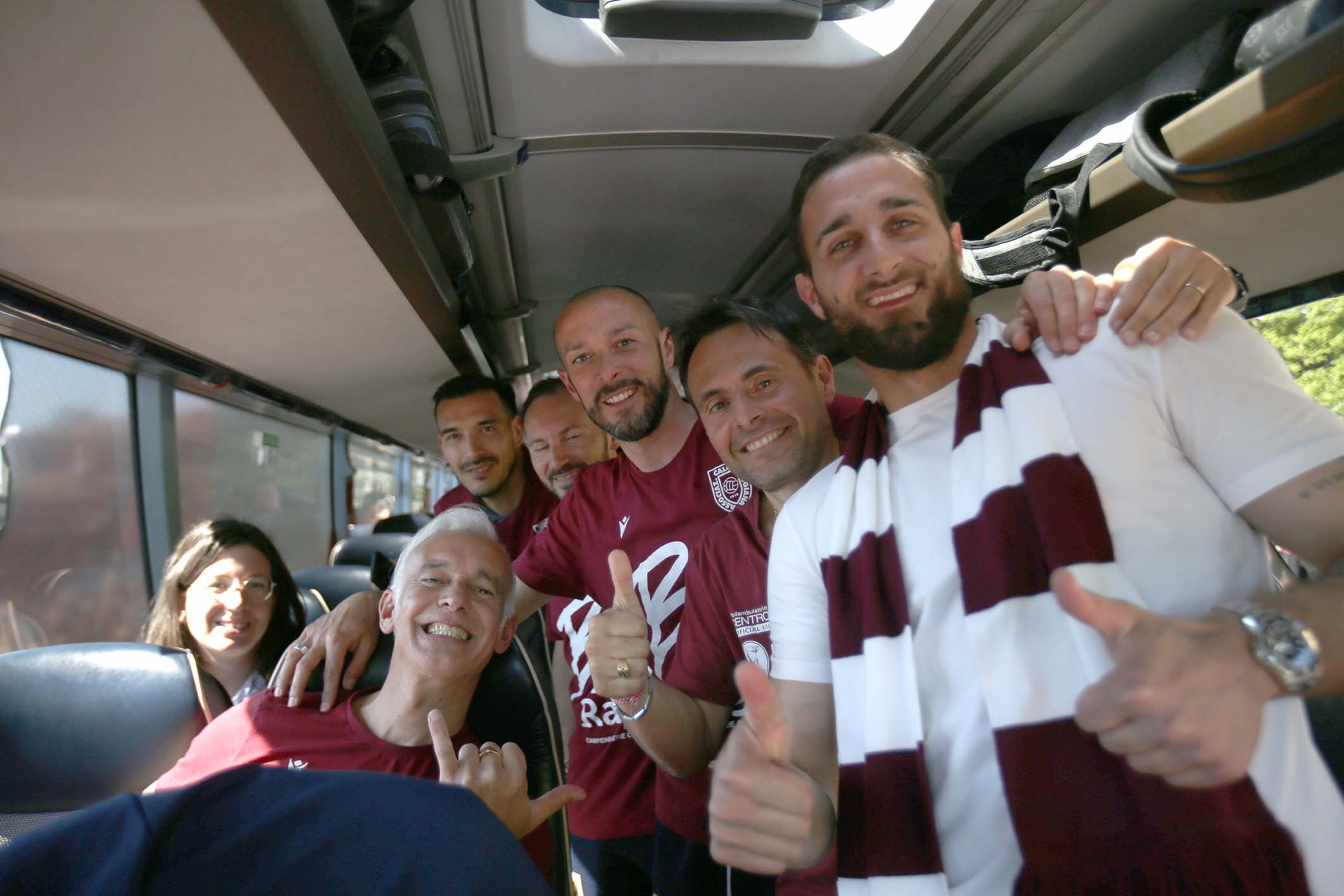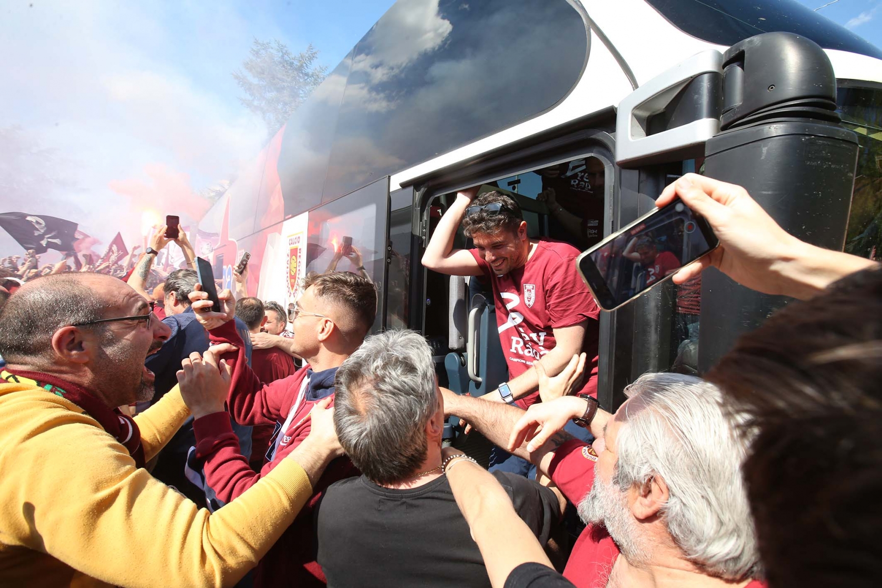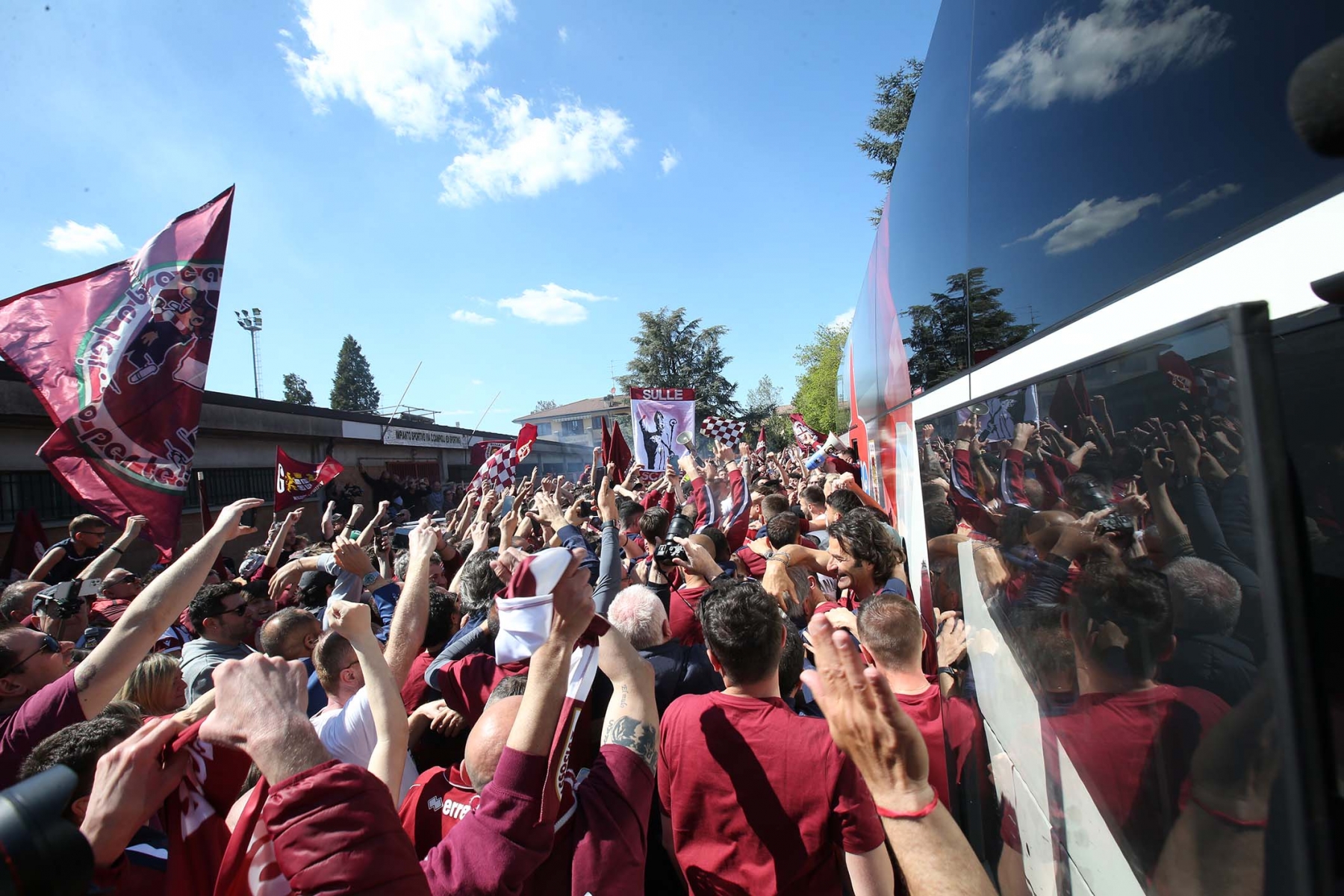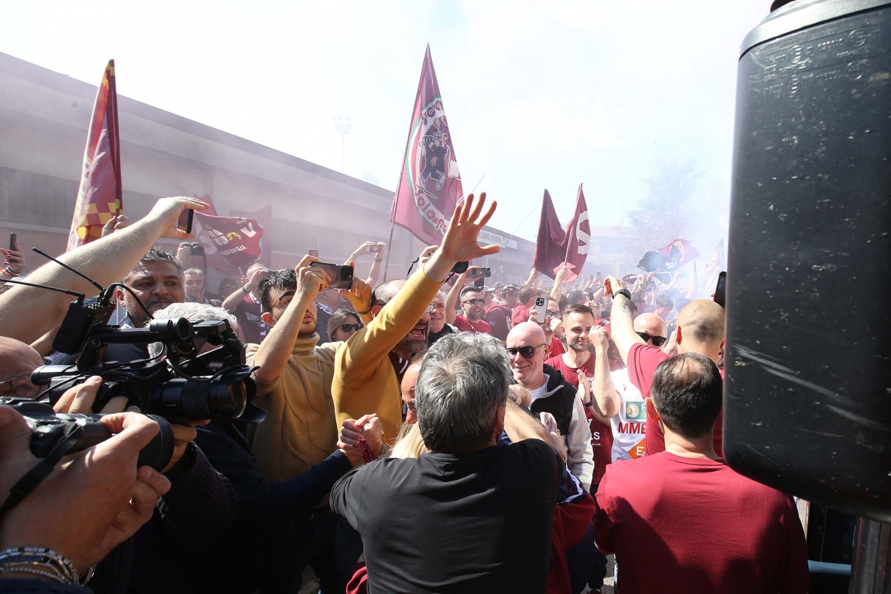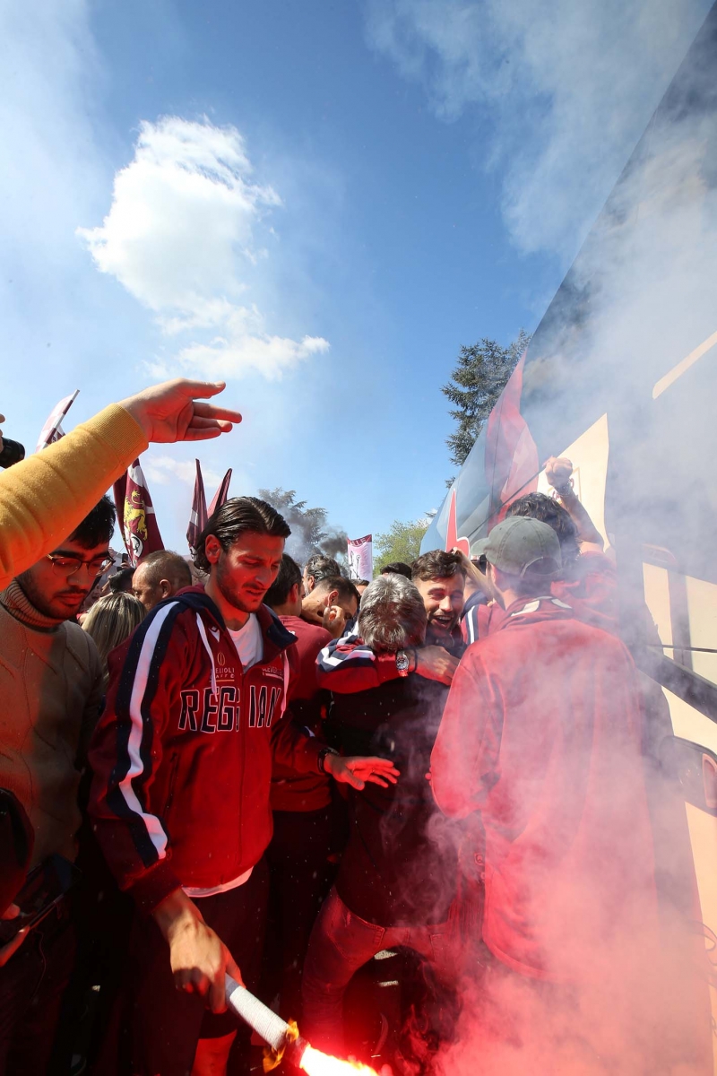 C’erano oltre 600 persone ad aspettare dirigenti e giocatori di rientro da Olbia dopo la sbornia promozione. Fumogeni, cori e tanta emozione per un campionato vinto dopo 15 anni