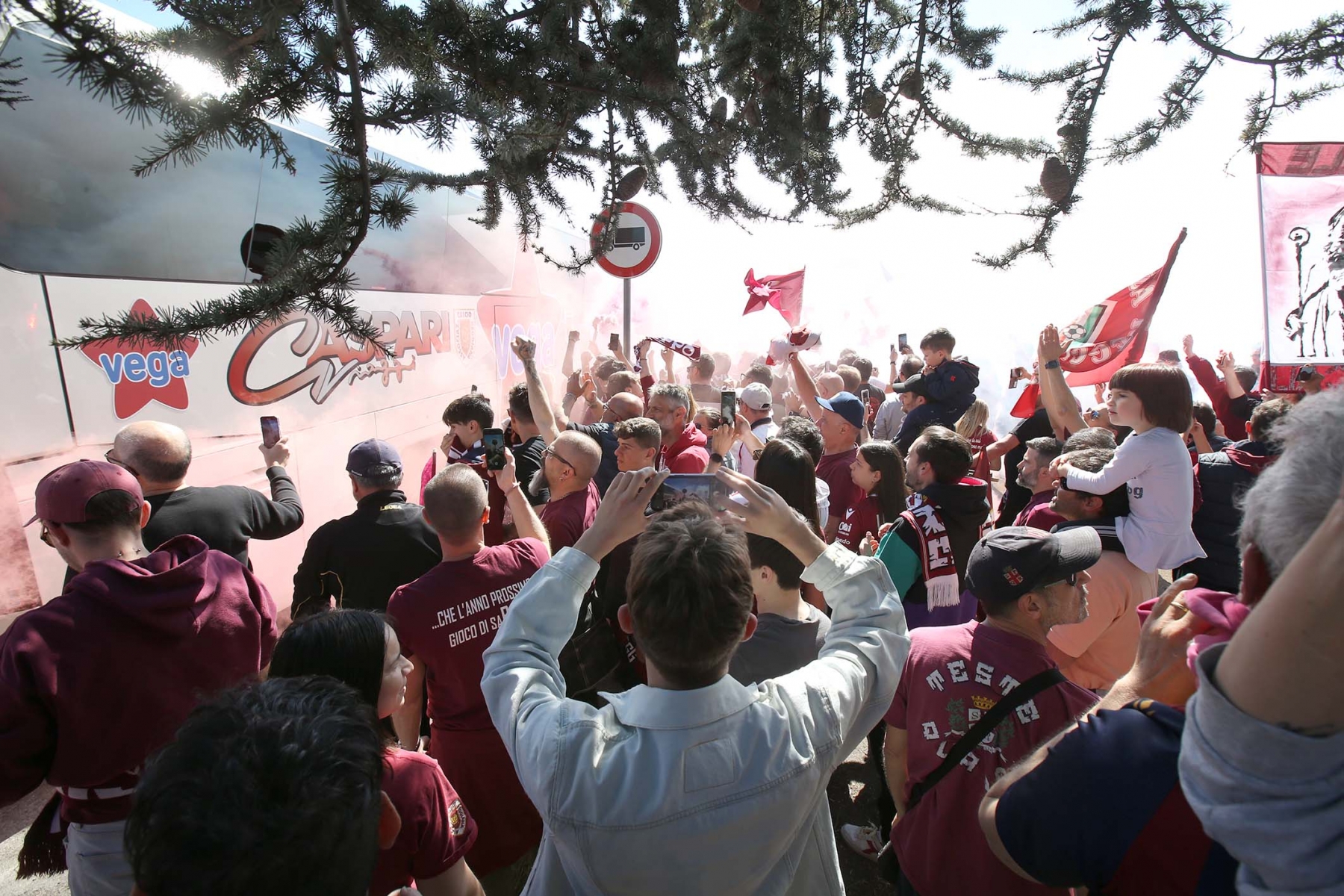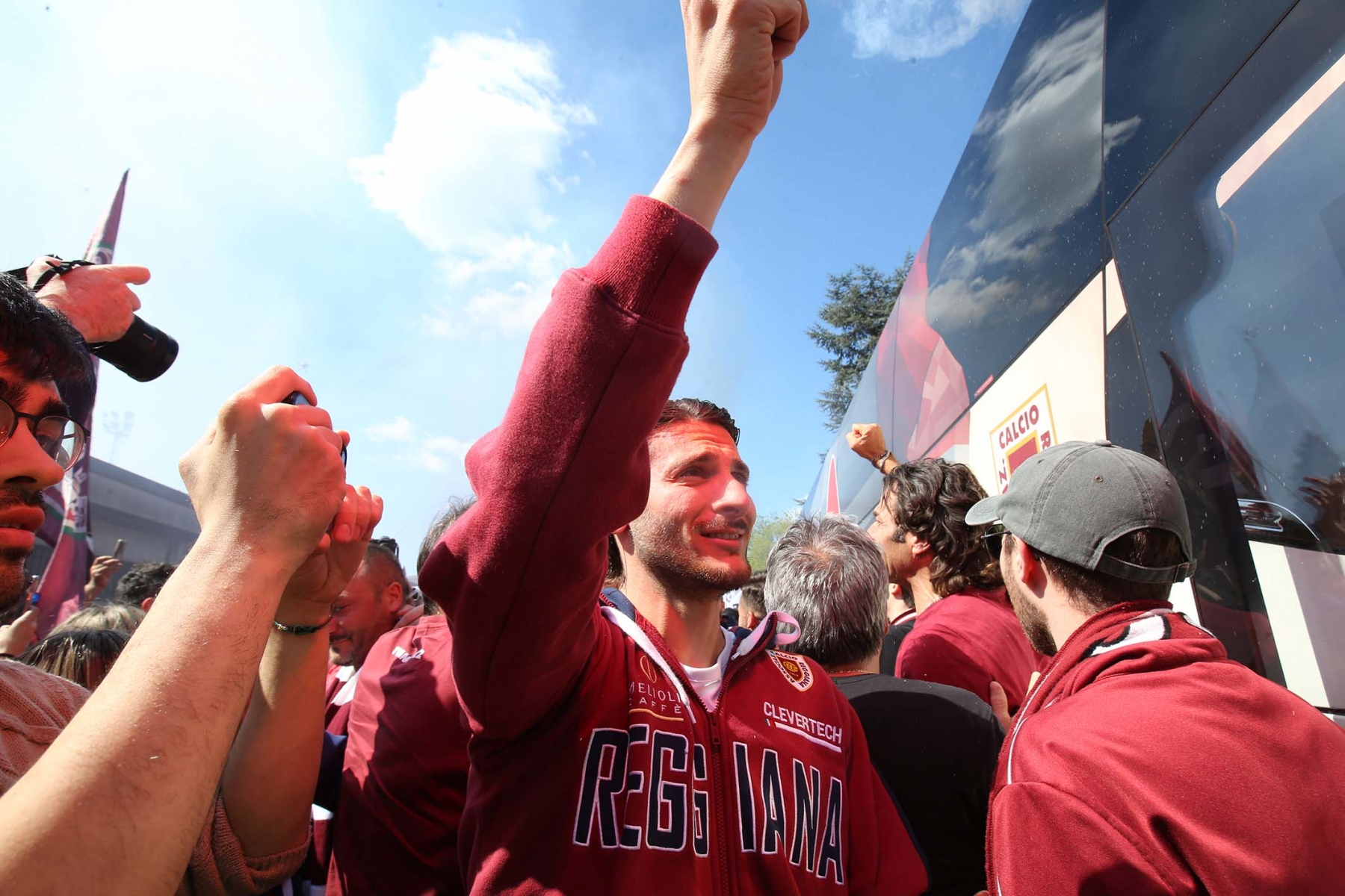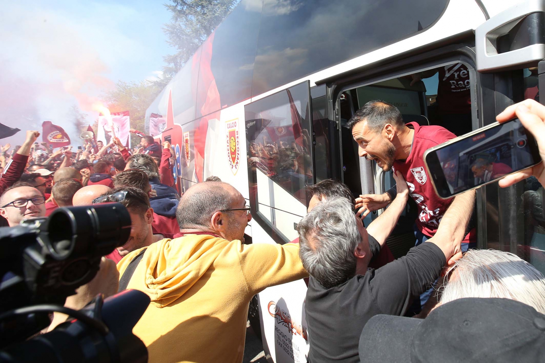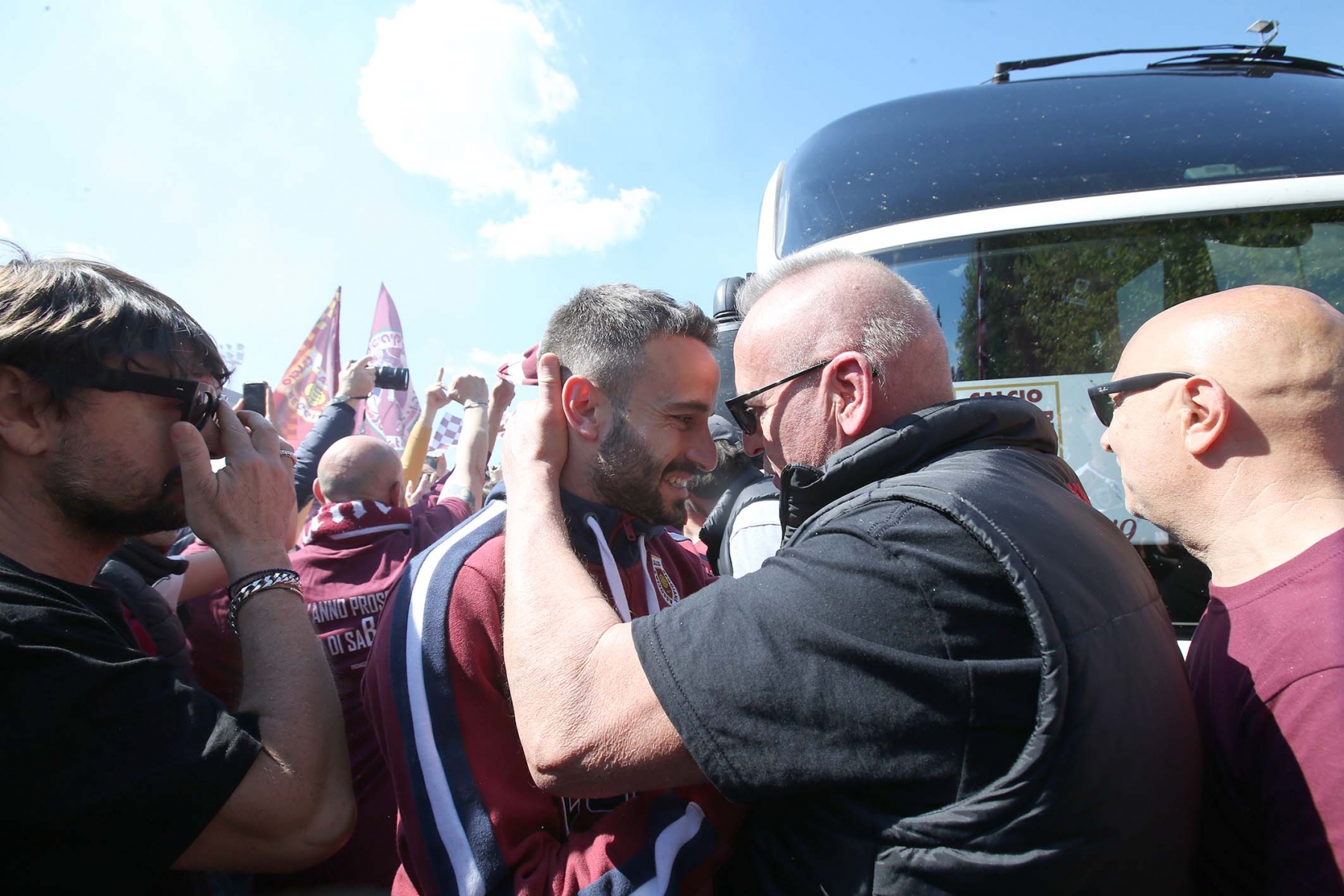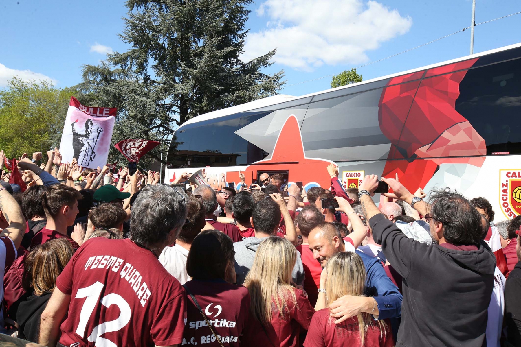 C’erano oltre 600 persone ad aspettare dirigenti e giocatori di rientro da Olbia dopo la sbornia promozione. Fumogeni, cori e tanta emozione per un campionato vinto dopo 15 anni
