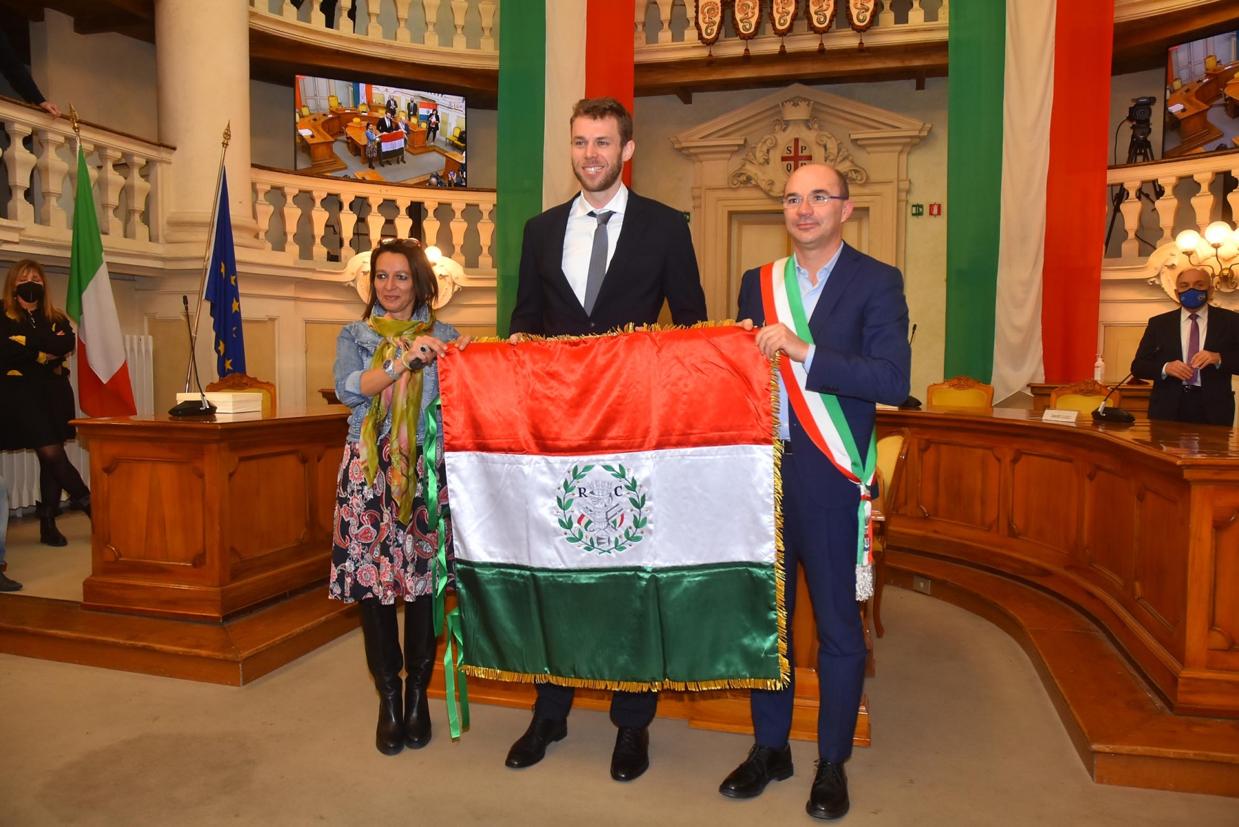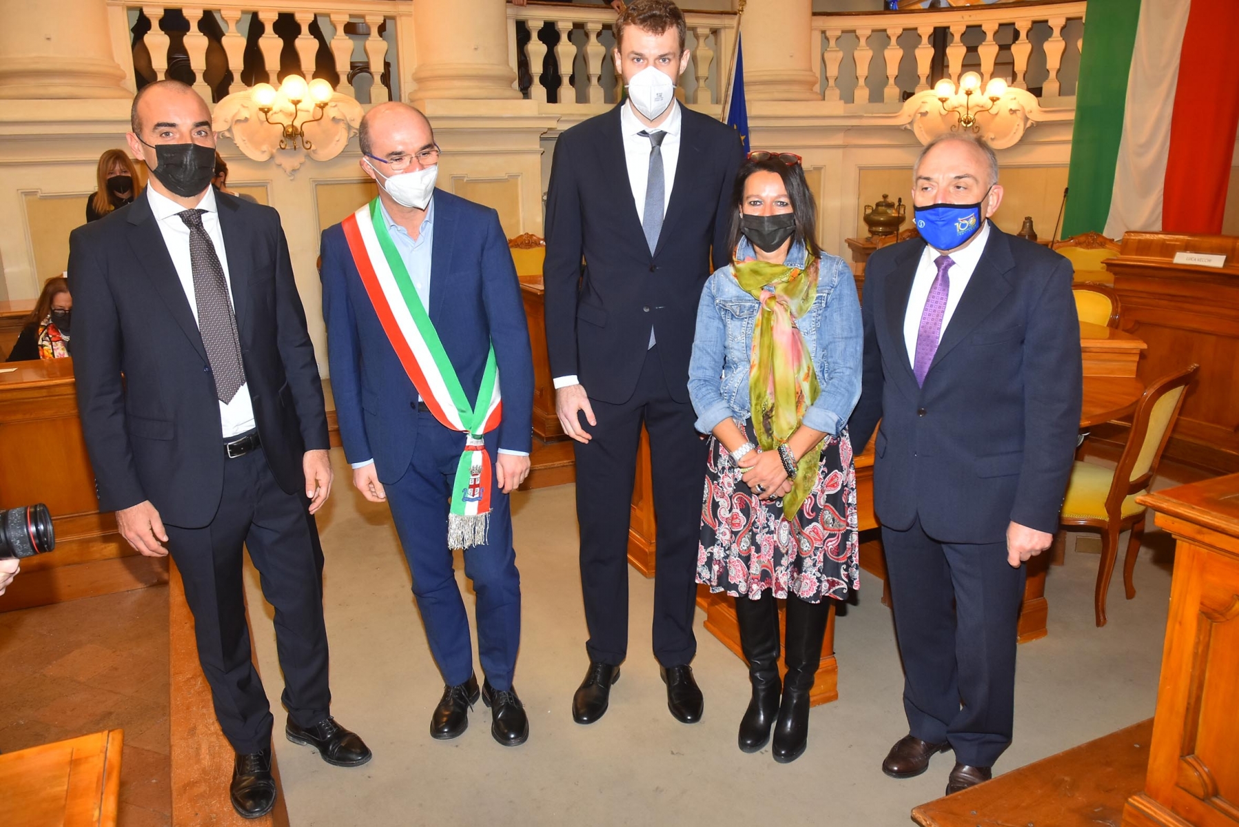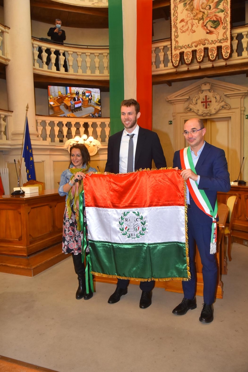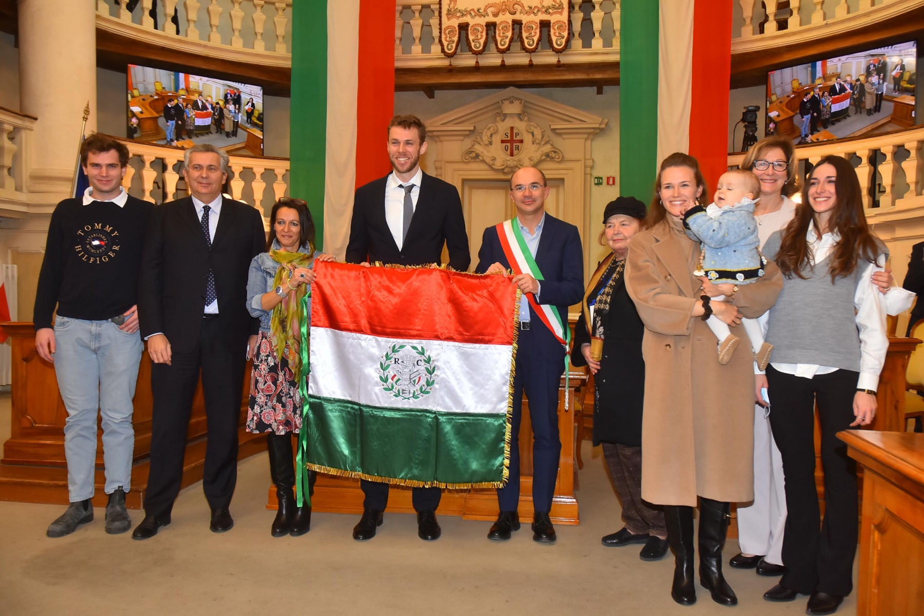 Primo Tricolore per Nicolò Melli, qui con la sua famiglia, il sindaco Vecchi e l’assessora Curioni