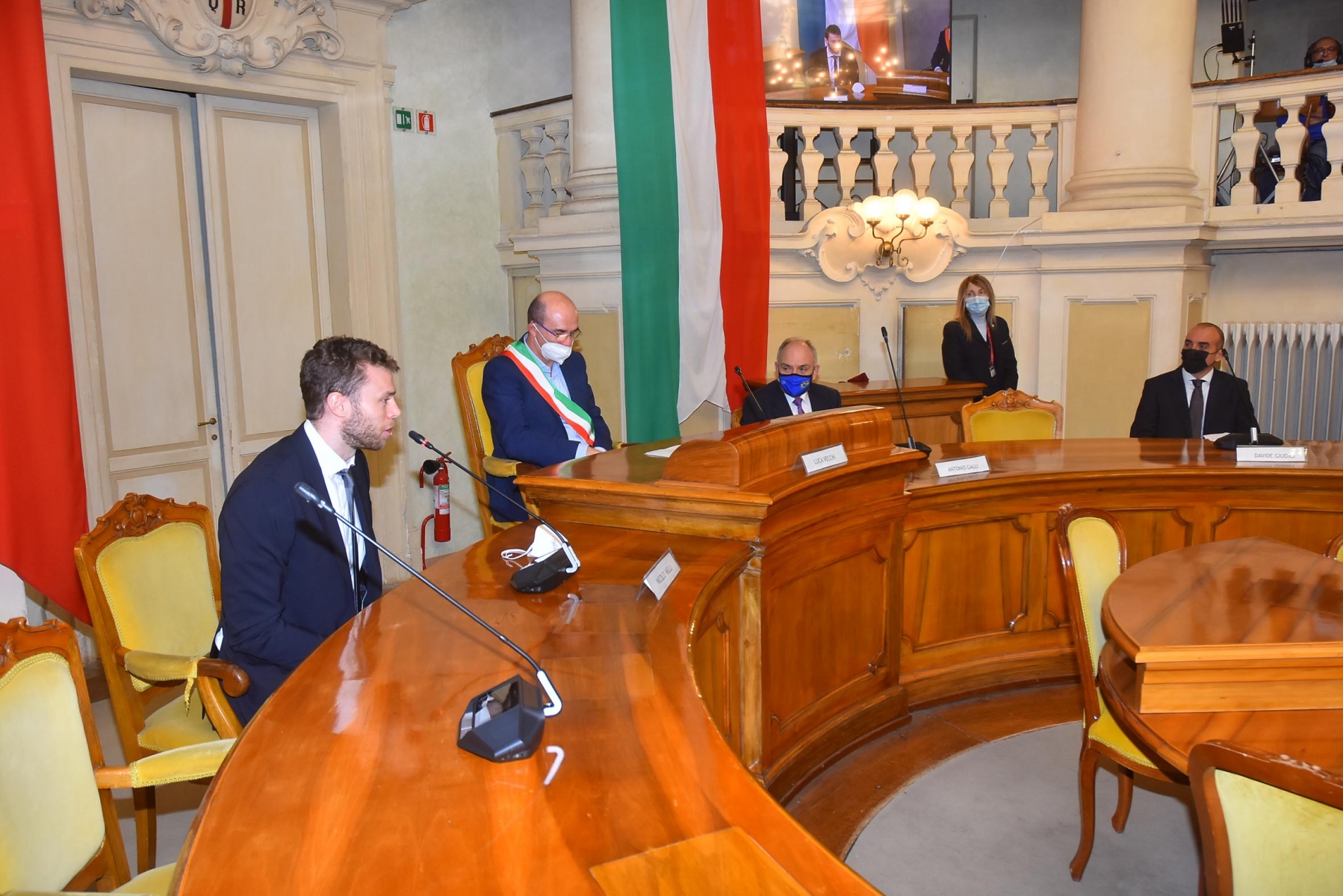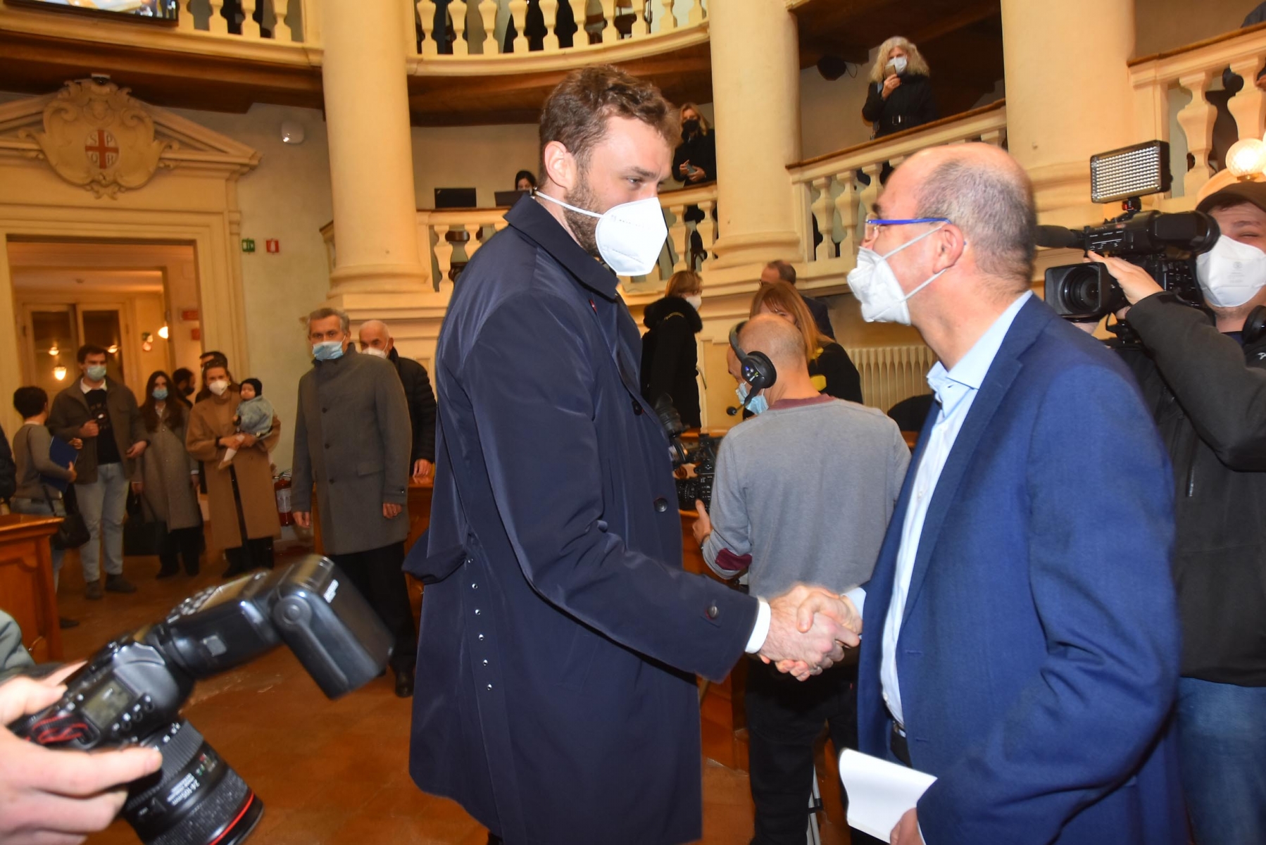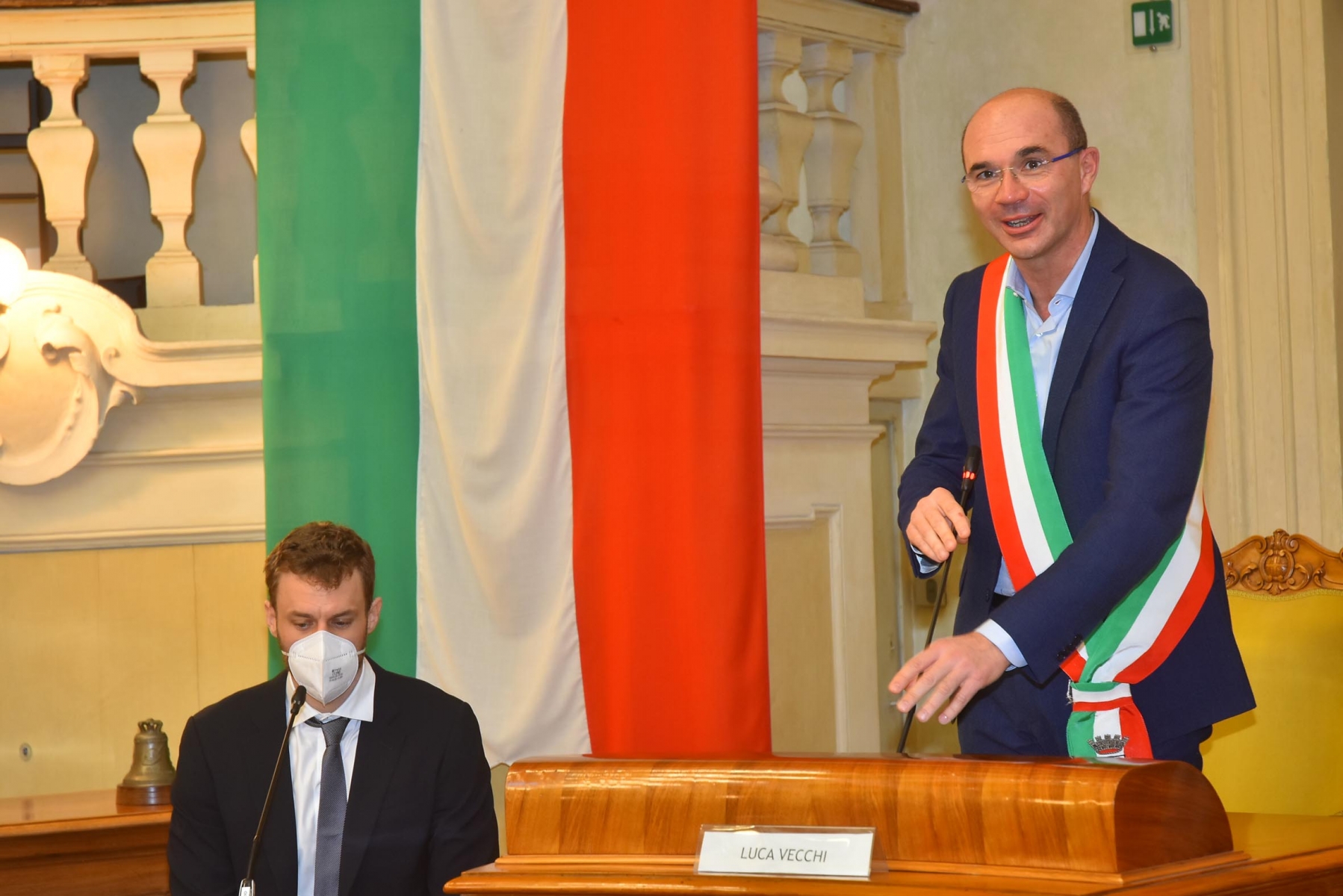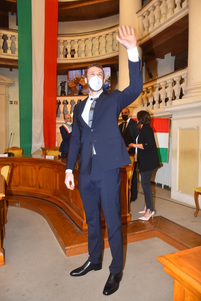 Primo Tricolore per Nicolò Melli, qui con la sua famiglia, il sindaco Vecchi e l’assessora Curioni