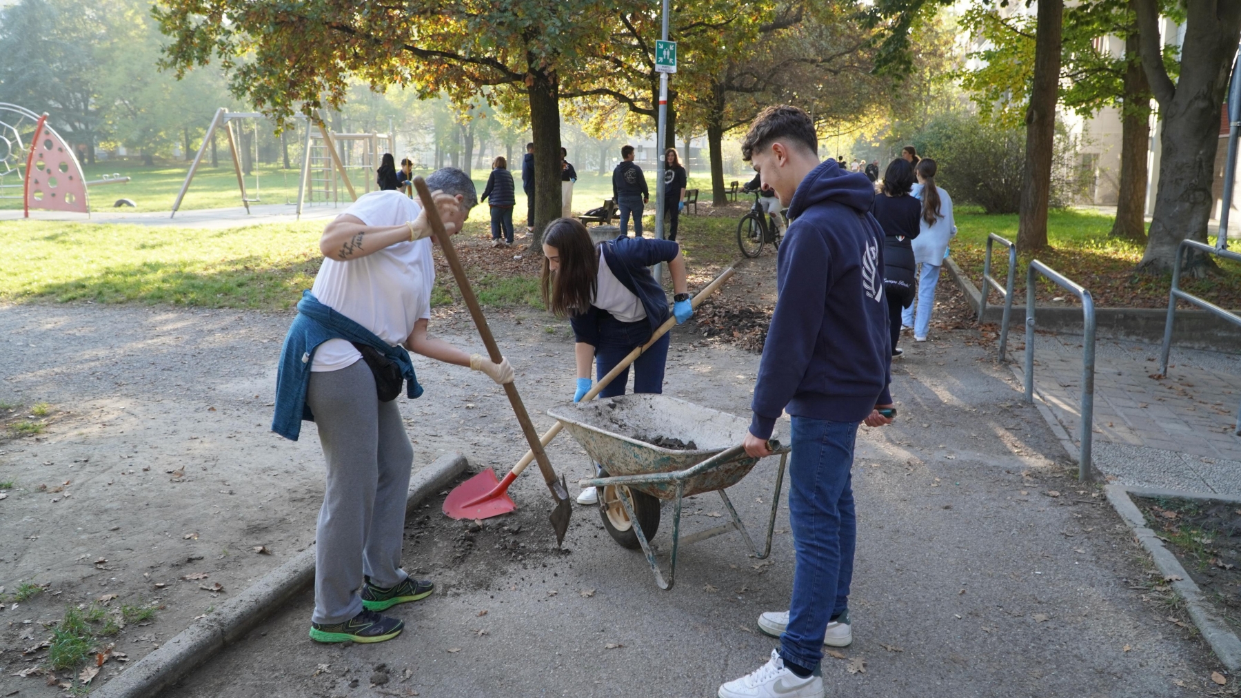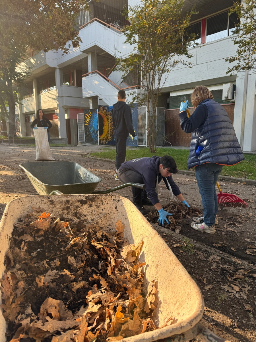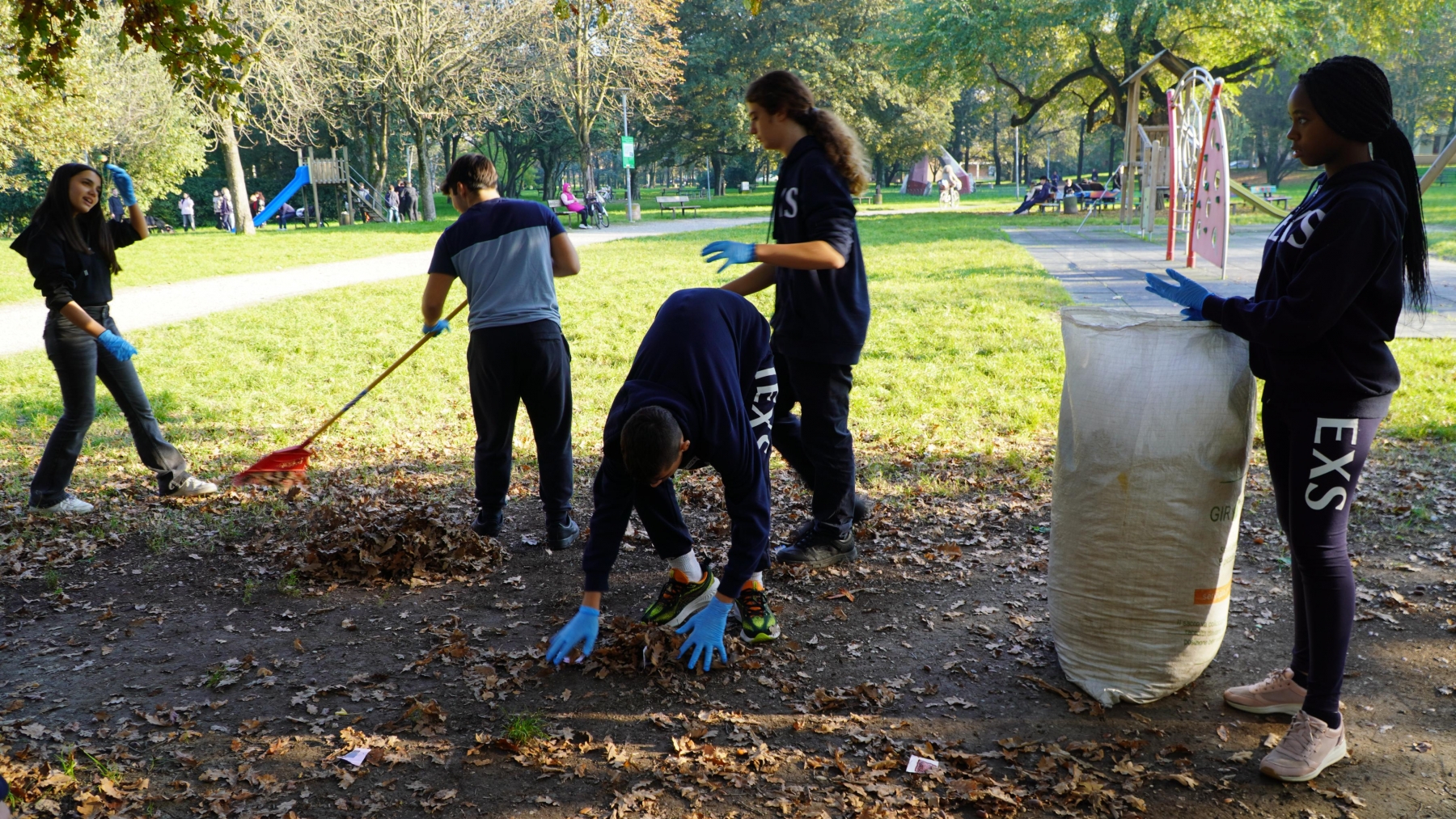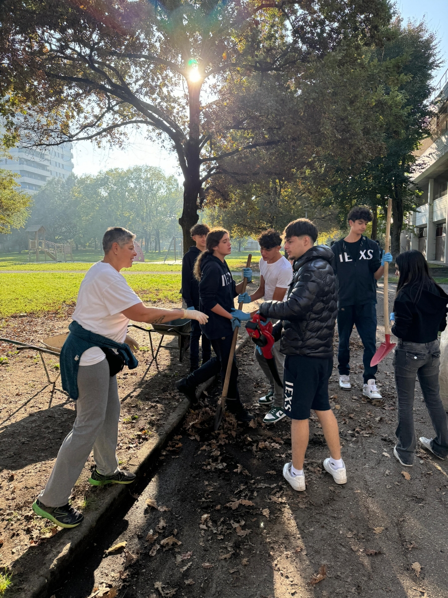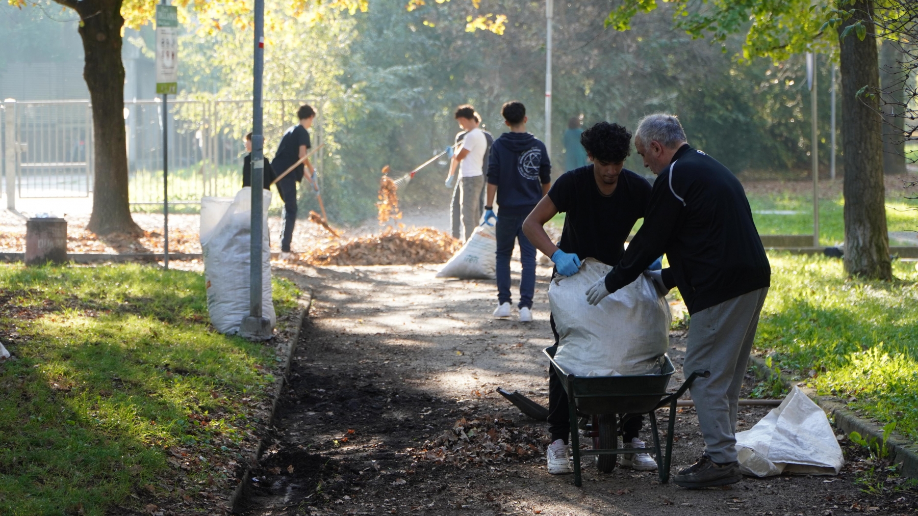 Sotto la supervisione di alcune insegnanti, i ragazzi si sono letteralmente rimboccati le maniche e, dopo pranzo, hanno aiutato, con tanto di rastrelli, vanghe e cariole, i residenti del quartiere a raccogliere le foglie cadute in queste settimane all’interno del Parco della Pace Oliver Tambo, ripulendo i viottolini interni al polmone verde della zona Sud della città.