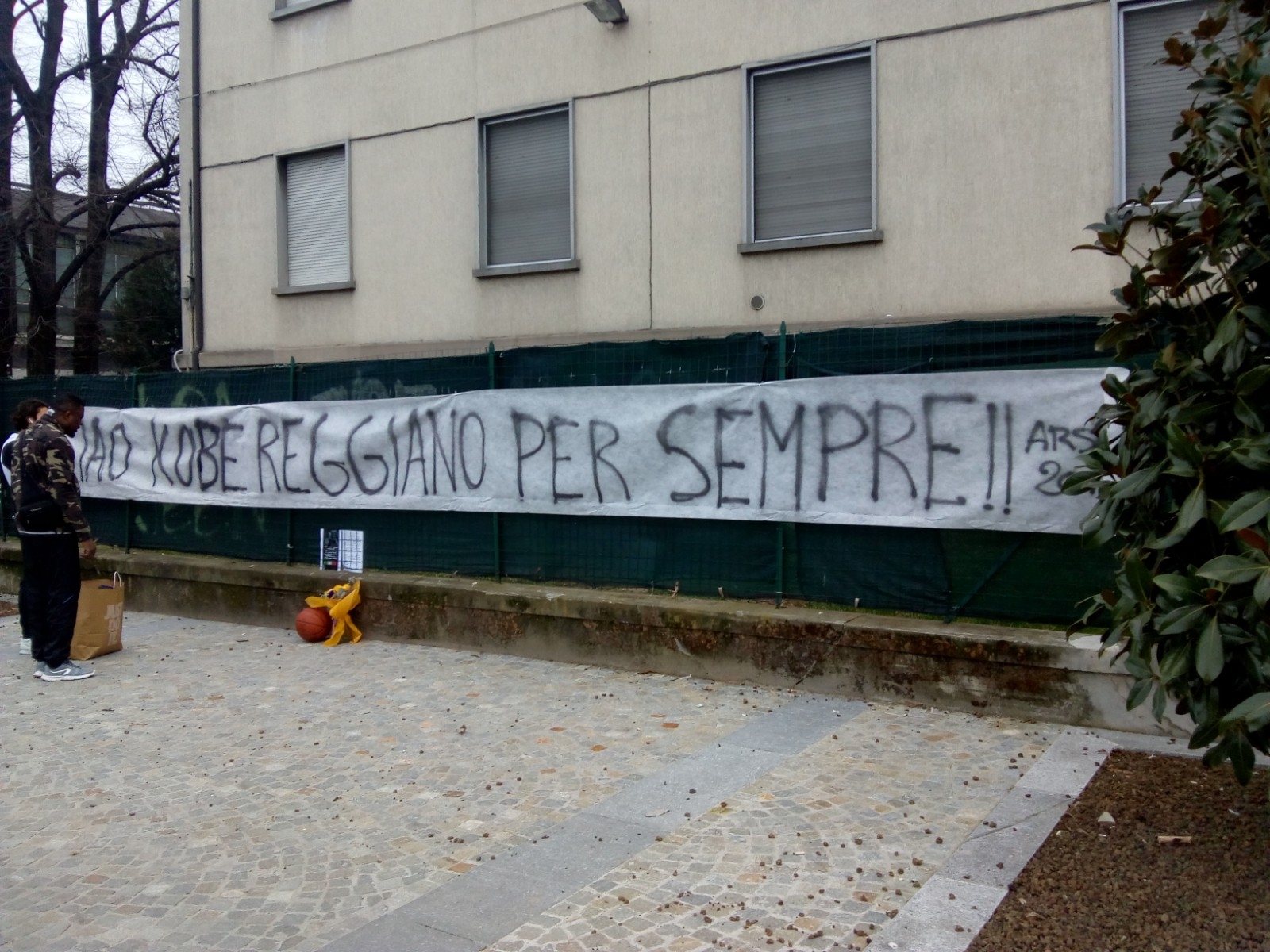 REGGIO EMILIA – Alla vigilia del giorno in cui i capetti di tutt’Italia rivolgeranno il loro omaggio a Kobe Bryant c’è chi ha pensato di ricordare la stella del basket andando in via Guasco, accanto al PalaBigi, nella futura piazza Bryant. Ai piedi dello striscione realizzato dal gruppo di tifosi “Arzan” della Pallacanestro Reggiana si è formata una sorta di altarino.