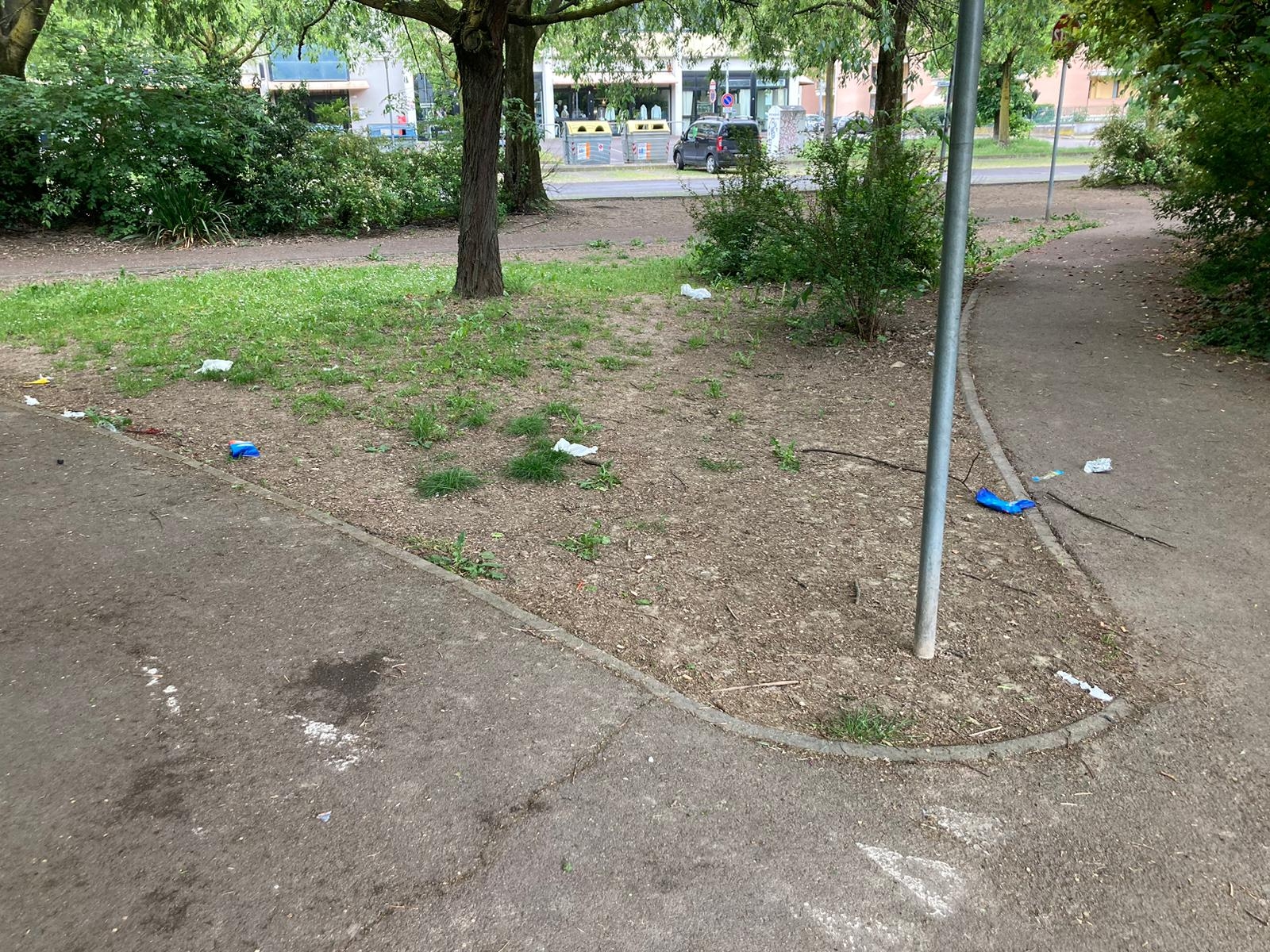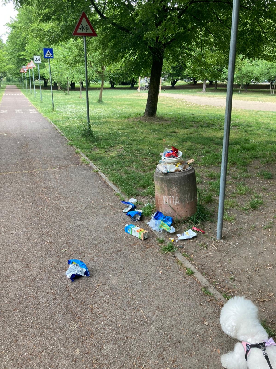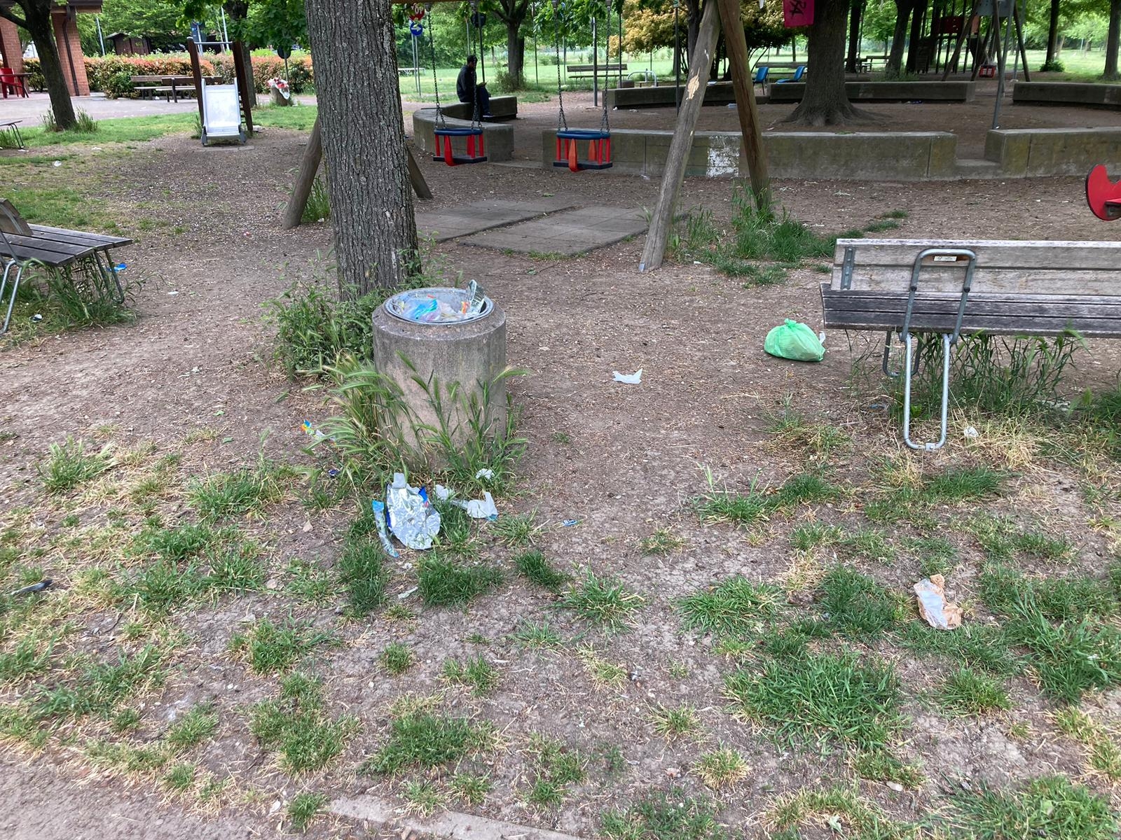 Le conseguenze della maleducazione nell’area verde di via Brigata Reggio. Sacchi abbandonati, cestini trabordanti e altri semivuoti ma con materiale a un passo di distanza