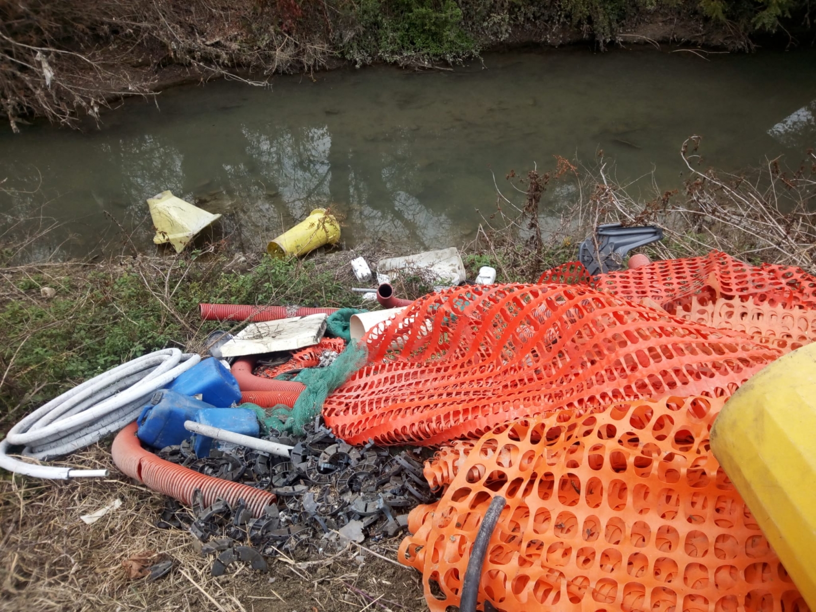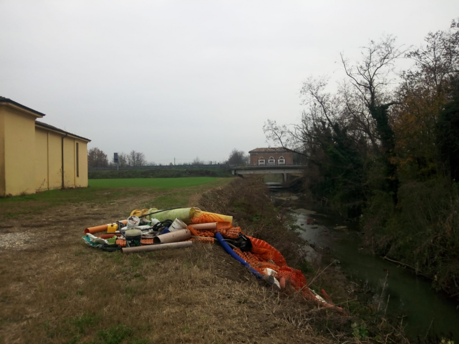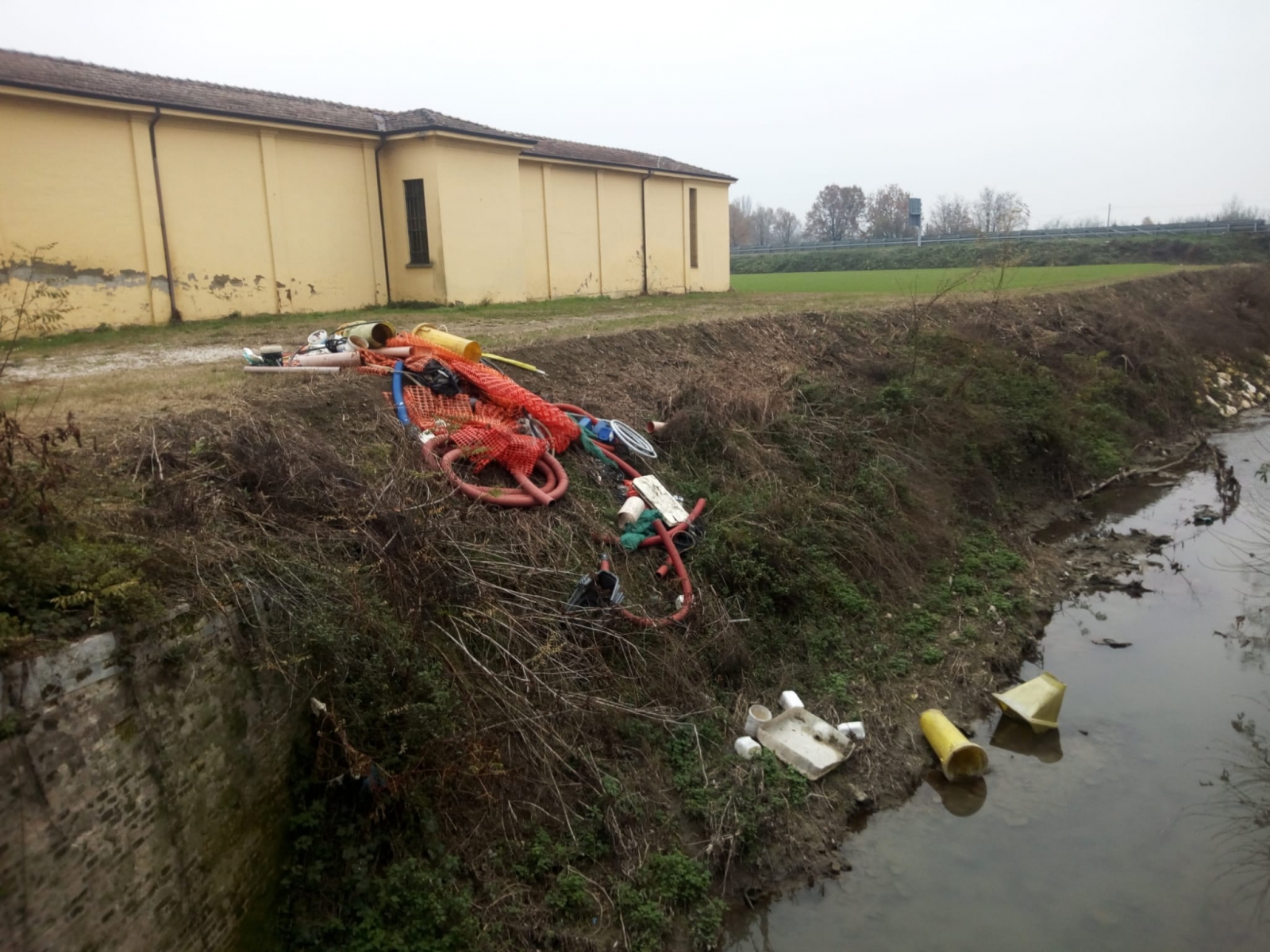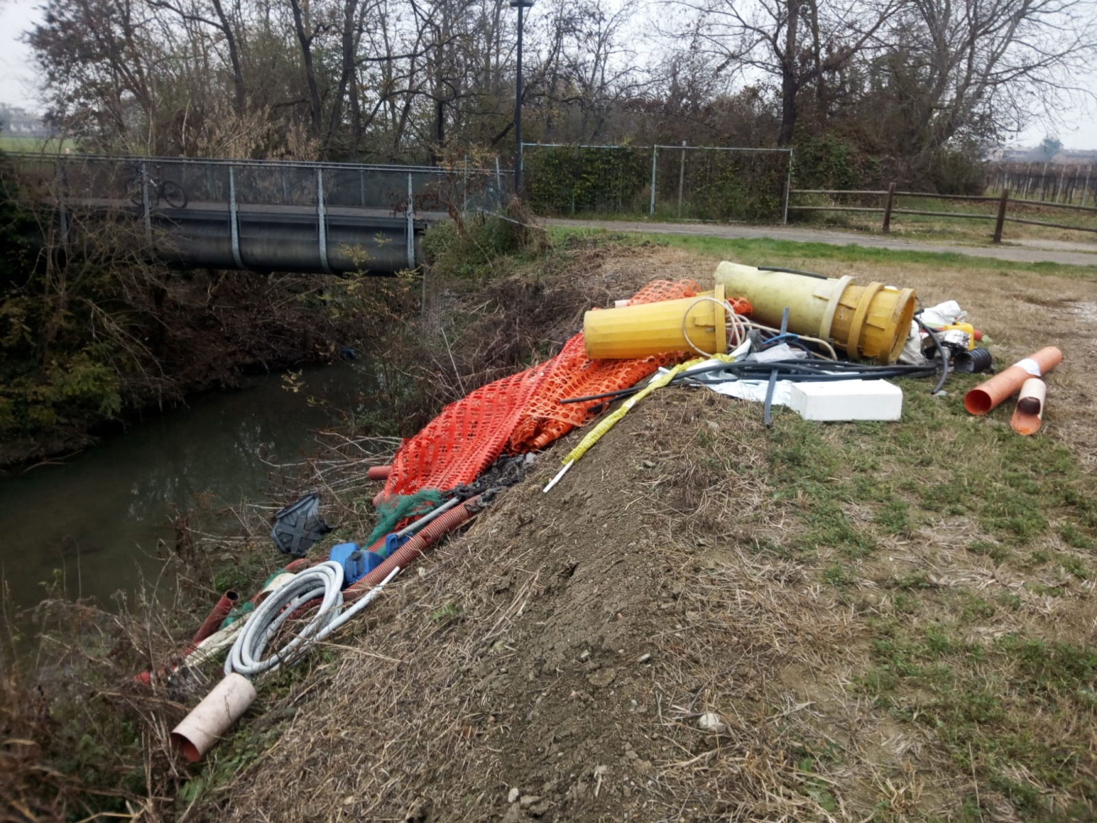30 novembre 2020Questa la situazione a Gavassa, nei pressi del cimitero: tubi, pezzi di grondaie, taniche e attrezzature da cantiere che alla prima piena rischiano di finire definitivamente nel corso d’acqua