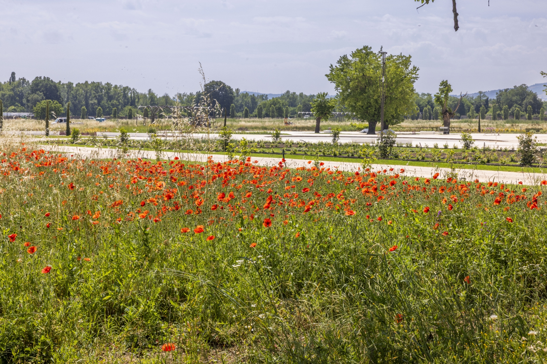 L’area centrale, suddivisa dai percorsi interni in grandi campiture, si presta a un utilizzo flessibile e riconfigurabile secondo molteplici esigenze, da quelle ludico ricreative a quelle agricole come la semina di fiori e colture scenografiche. A rimarcare le intersezioni dei percorsi sono state collocate pergole in metallo a cui si arrampicherà la vite a ricordo della vocazione agricola della tenuta. Il verde è protagonista prendendo spunto dall’ecologia locale e dai diversi paesaggi storici che si sono susseguiti.