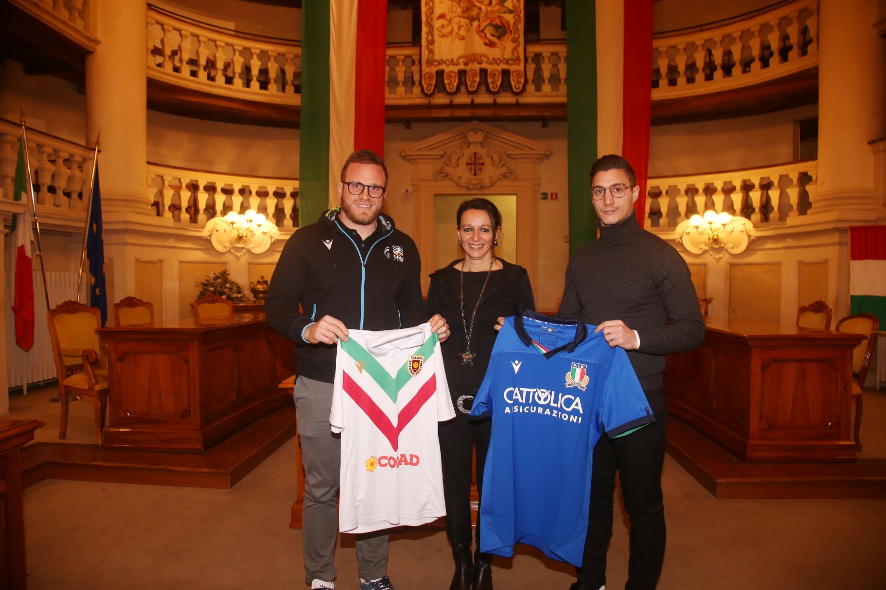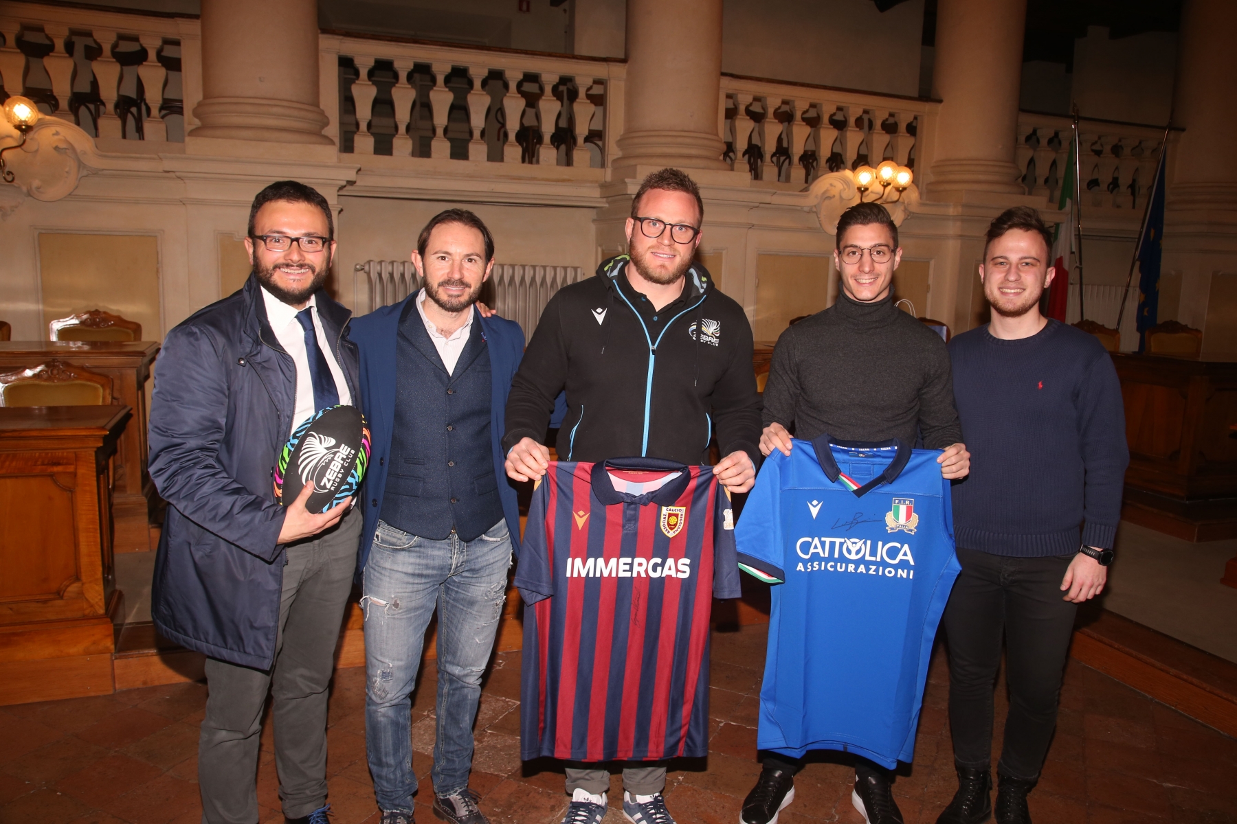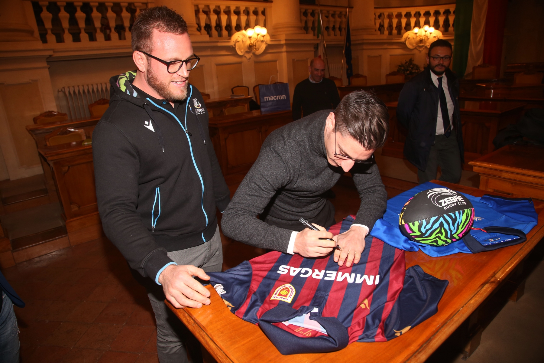 REGGIO EMILIA – Sport e fair play ieri pomeriggio in Sala del Tricolore, dove il reggiano Luca Bigi, capitano della nazionale italiana di rugby al prossimo Sei Nazioni (il debutto sabato 22 febbraio a Roma contro la Scozia), e il capitano della Reggiana calcio Alessandro Spanò si sono scambiati le maglie. Presente anche l’assessore allo sport del Comune di Reggio Raffaella Curioni.