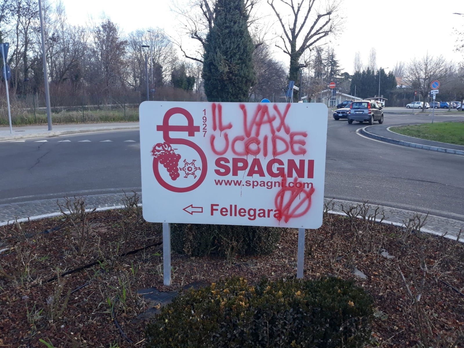 SCANDIANO (Reggio Emilia) – “Il vax uccide”, “nazismo sanitario”. Sono tra gli slogan comparsi questa mattina a Scandiano. Scritte di vernice spray rossa impresse in più punti del paese, ad esempio sulla pavimentazione all’esterno di una scuola, sul muro di un cimitero, oppure sulle pareti del capannone delle Fiere che attualmente svolge la funzione di centro vaccinale. Uno striscione è stato appeso sul cavalcavia della provinciale ed è stato imbrattato anche il cartello all’interno di una rotatoria.